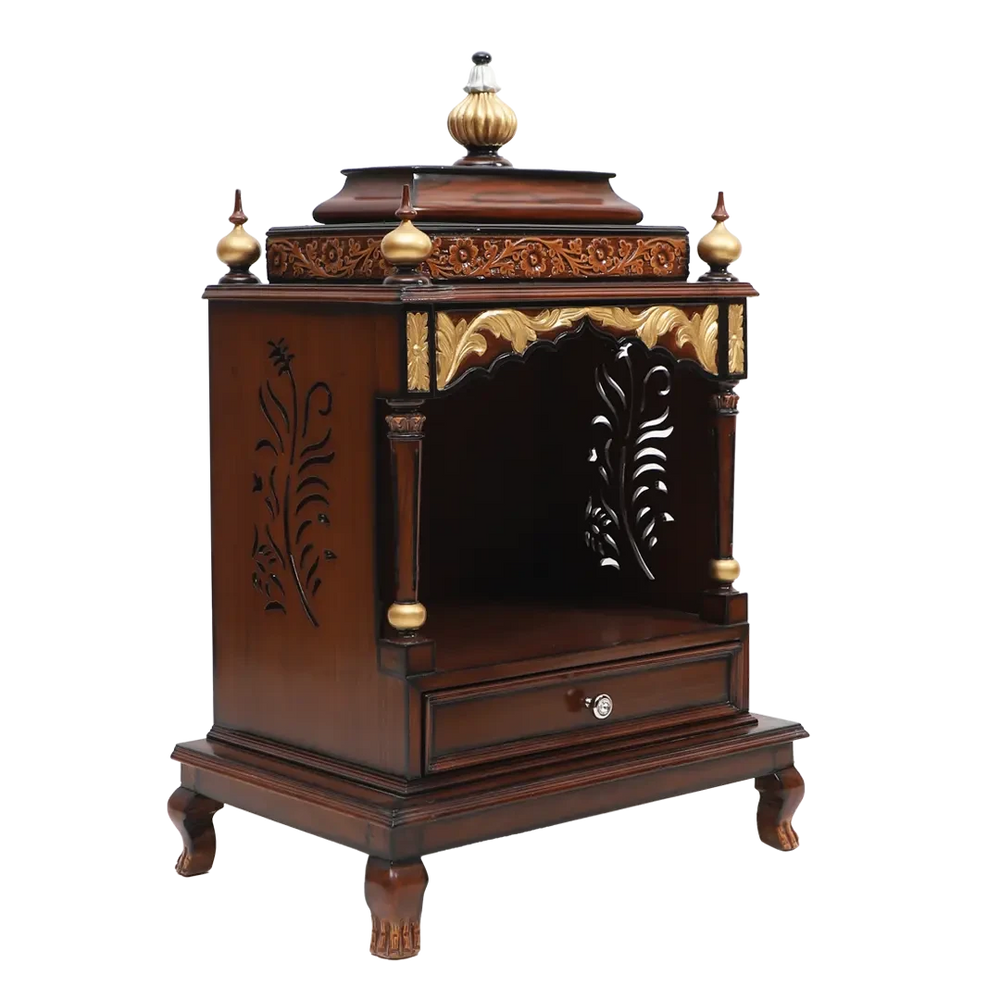 There are no second thoughts on the use of teak wood for crafting wooden mandir for home because teak wood is one of the best materials that is very strong, durable, and has an aesthetic look. The brown color pooja mandir for home in teak wood has longevity and minimal maintenance which makes it a fantastic renovation for any house. Teak wood naturally has a richness that is appealing in a home temple, but also has the ability to stand up to as many natural factors as you want to throw at it.