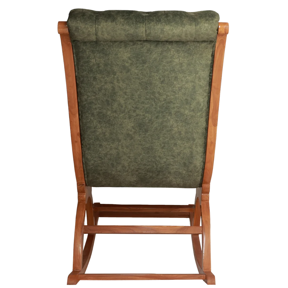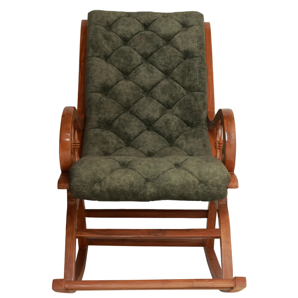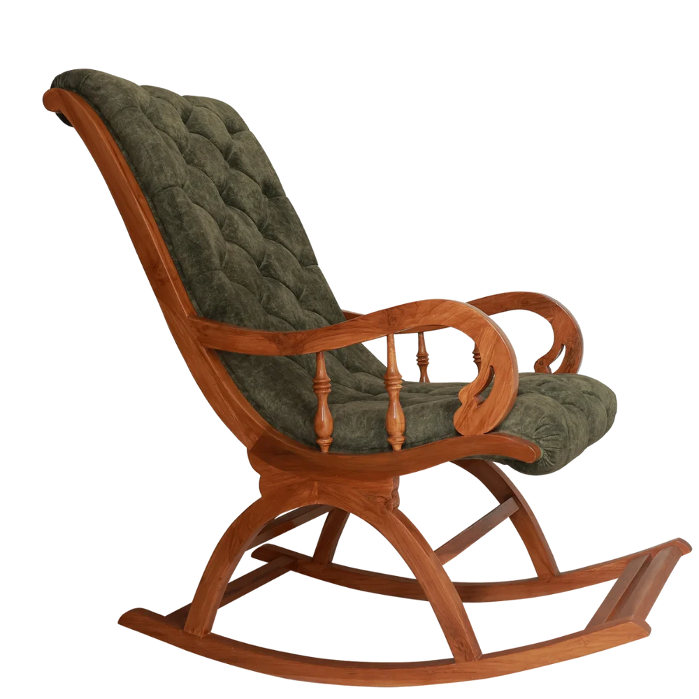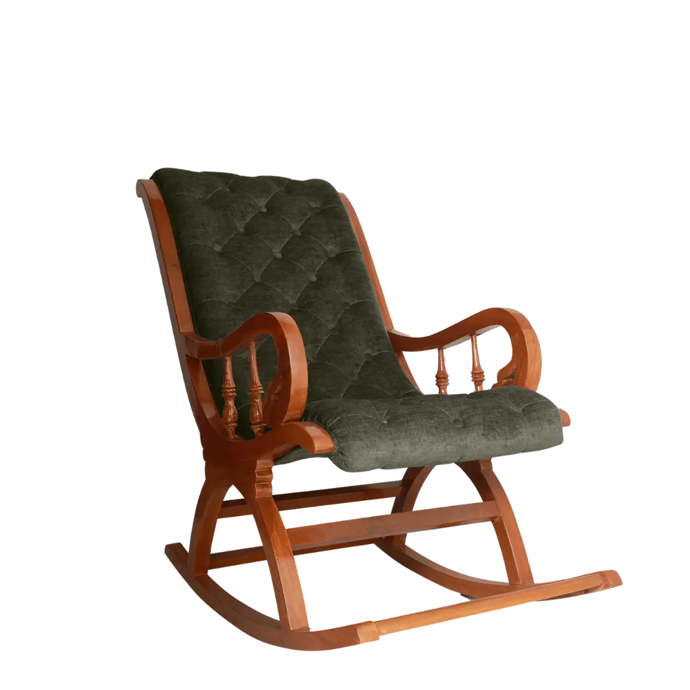 The wooden rocking chair is the perfect mix of elegance, comfort and functionality, along with its beautiful design. The chair’s smooth curves and detailed armrests reflect expert craftsmanship which ensures a sturdy and stylish design that will last for years to come. The forest green upholstered seat followed by the tufted design adds a touch of luxury to the cushioned rocking chair and offers the best comfort. The combination of teak and forest green color makes this chair more beautiful. The high backrest and extra padded seat are conveniently designed to support your posture and make this resting chair perfect for long periods of relaxation. Whether you are looking to elevate your living space or create a cozy retreat for yourself, this wooden rocking chair is a great choice for your home. The combination of luxury, durability and style makes this wooden relaxing chair more than just furniture as it’s a statement piece that brings charm, sophistication and comfort to your everyday life.