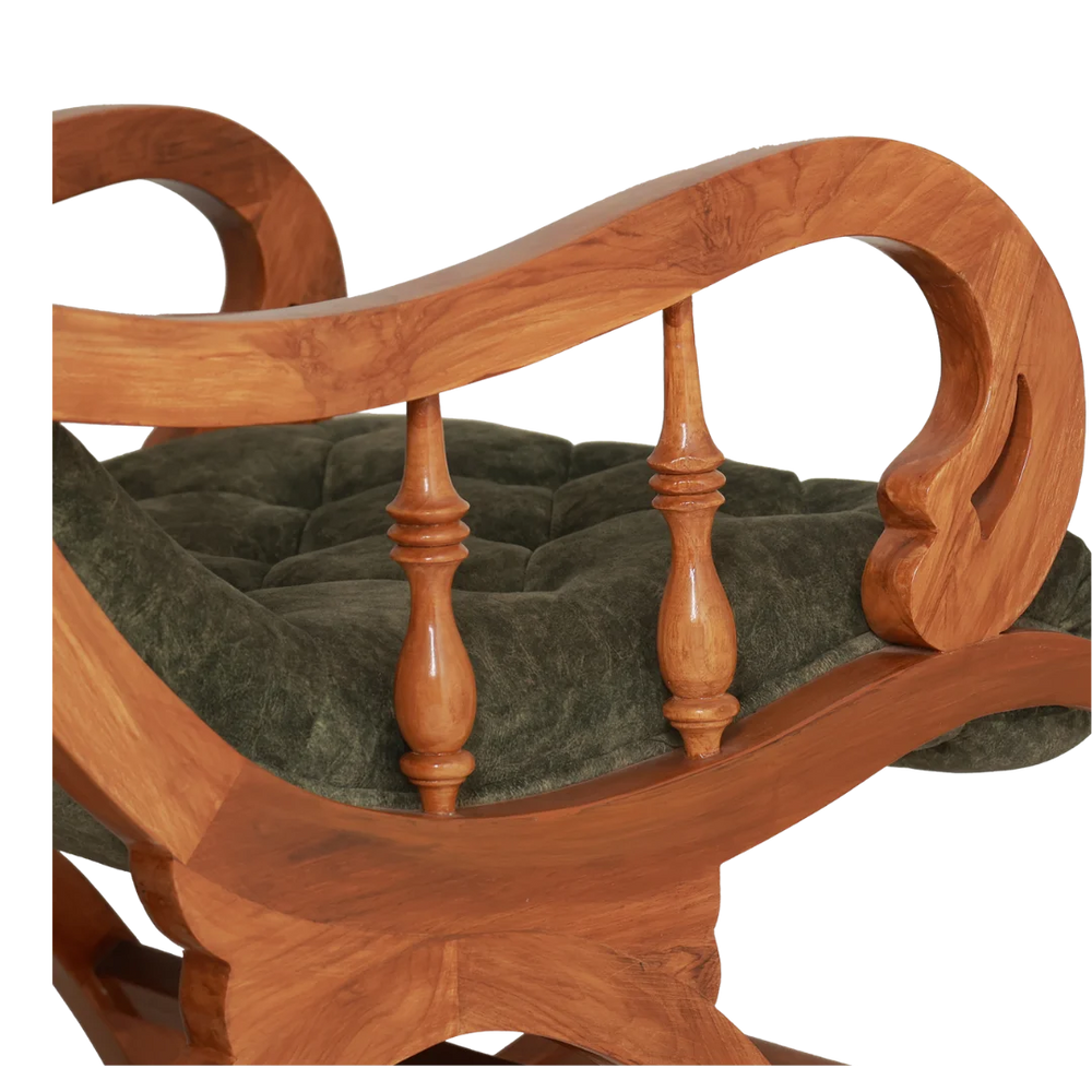 The design of this rocking chair shows its excellent quality craftsmanship. From the exquisitely worked armrests through to the curved runners from the back to the seat, every detail is carefully designed to balance practicality and style. Correctly executed armrest spindles are a measure of the skill in construction and of the beauty of the furniture in general. This resting chair is a chord vibration between the deepest of forest green cushions and a stunning, warm wood tone, which naturally catches attention. The chair has a simple design and elegant style that suits both traditional and modern homes while adding charm and functionality to any space. The understated style and versatility of this aaram chair allow it to complement any design scheme without dominating the space.