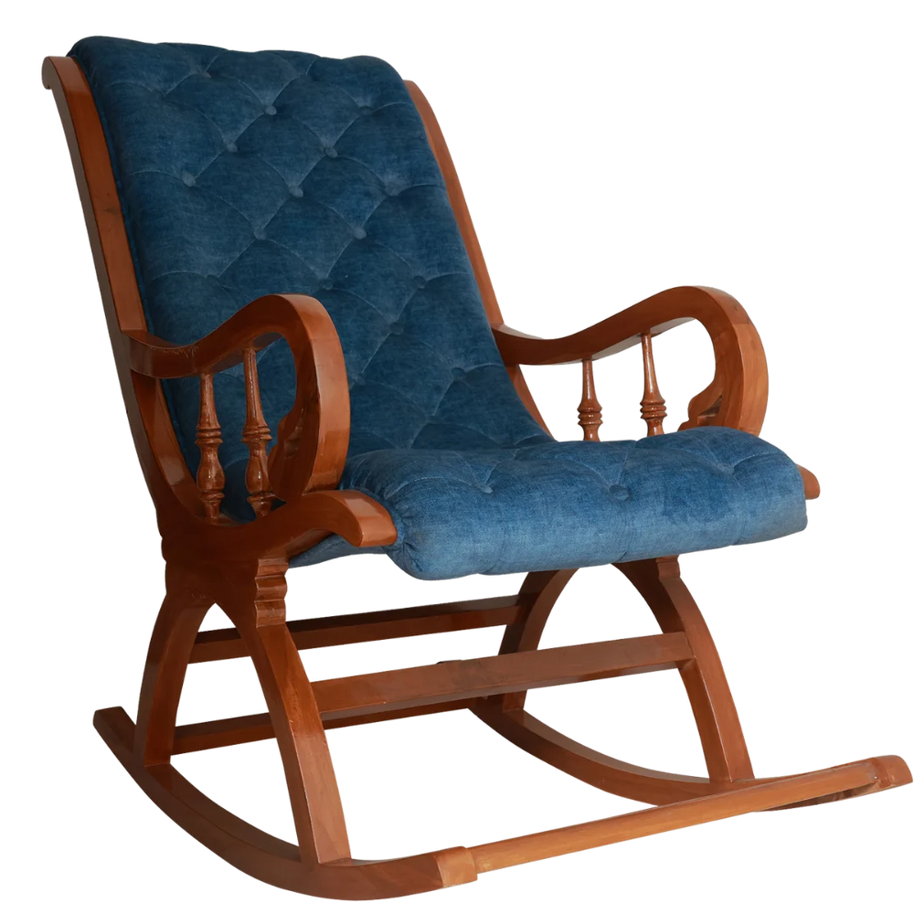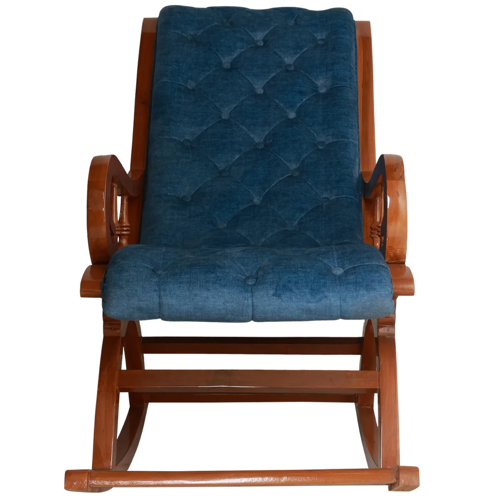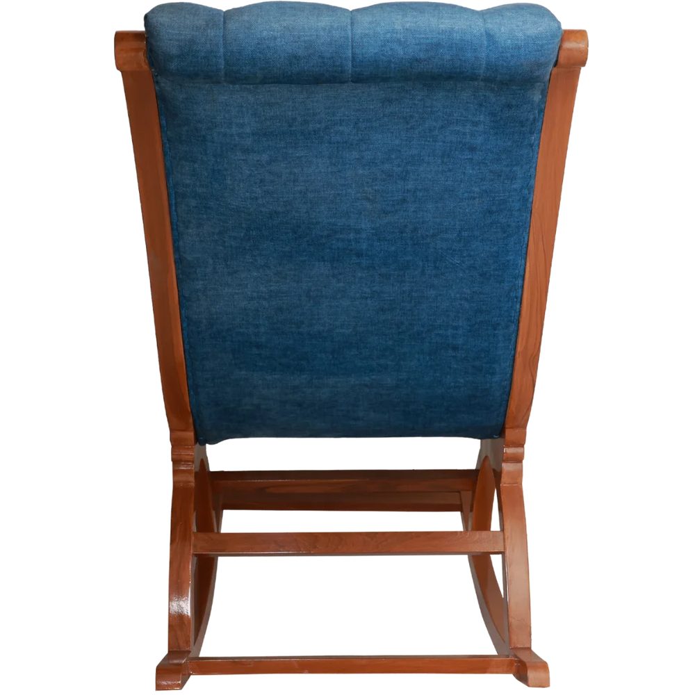 The deep, rich indigo-blue upholstery of this rocking chair adds a vibrant touch to any space. The bold yet elegant color of the wooden resting chair enhances the visual appeal and makes it stand out in your room. The tufted design adds elegance to the chair and the bright color matches both neutral tones and bright decor. This aesthetic addition creates a setting that balances perfectly between style and comfort. Whether it is a cozy corner or a modern living room, this bright wooden rocking chair shows great style. The color of the wood matches the indigo-blue upholstery and gives the chair an overall classy look.