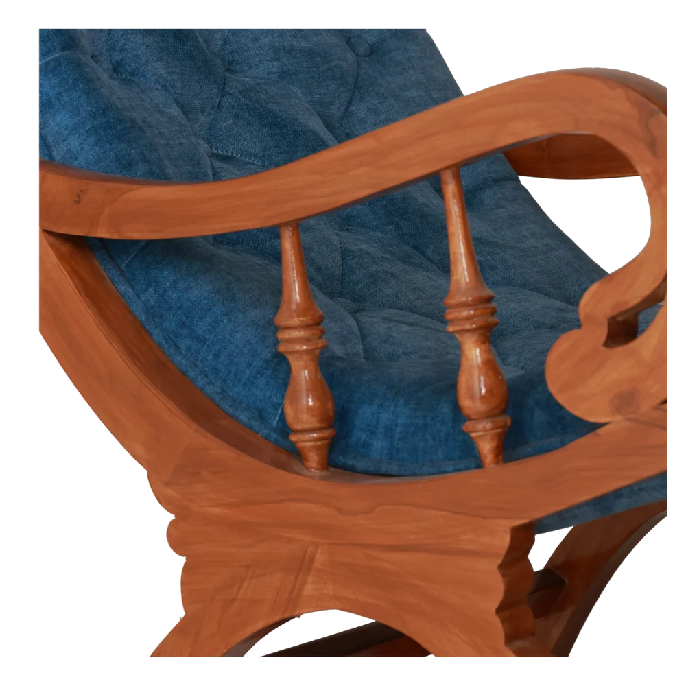 This wooden resting chair is made of solid premium wood. The solid teakwood ensures that the cushioned rocking chair will last long, even with regular use. The chair is durable in design while carrying timeless elegance. The chairs are detailed and have a smooth finish with armrests and leg carvings of natural wood grain. This gives the wooden relaxing chair a refined and elegant look. When the traditional design of the wooden chair is matched with a soft indigo blue cushion, the chair looks comfortable and attractive. This wooden rocking chair easily fits in anywhere and upgrades the aesthetics of your space.
