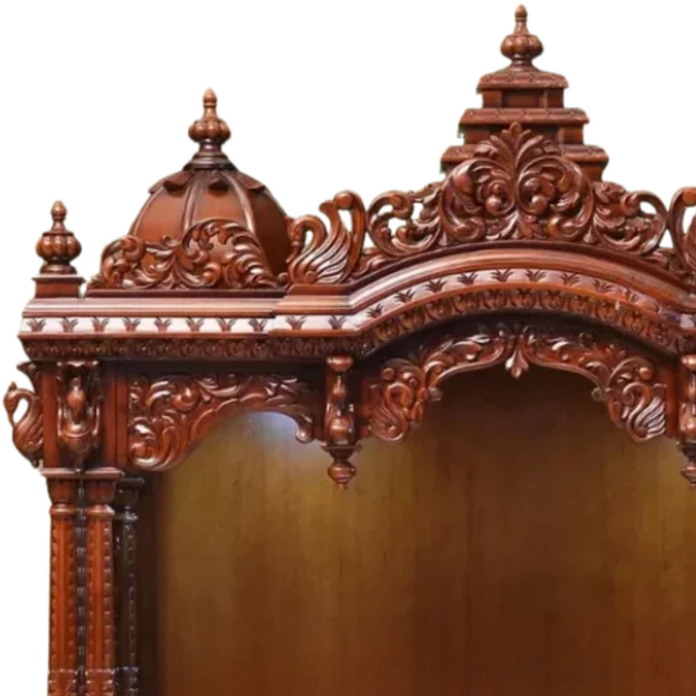 For those who are looking for a large pooja mandir, this is perfect. Now let's talk about the round, dome-like pillars on both sides of this big home temple, which give it a royal look. The strong, round pillars are made to provide extra support to the mandir on both sides. These pillars not only give strength to the temple but the dome design gives it a magnificent look. They also make the temple look bigger, beautiful and traditional due to the intricate carvings. These pillars give the wooden temple a real temple feel and look. Also, these pillars help in keeping the whole structure in balance.
