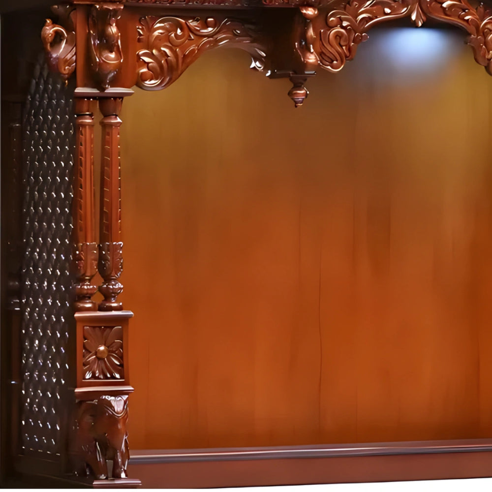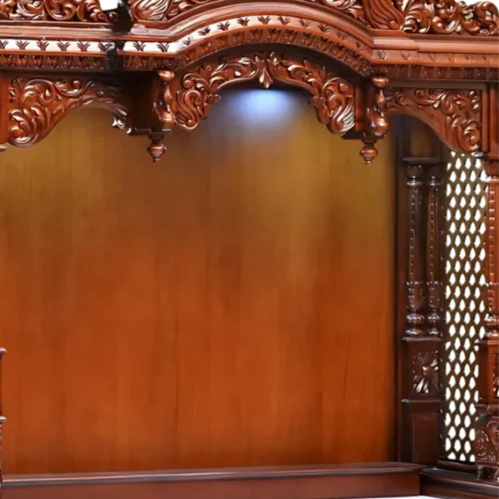 All parts of this mandir have beautiful carvings and utility. The jaali design made on the side panels of this big temple makes it special and makes it easy for light to enter. The detailed jaali patterns on both sides make this large mandir for home look more beautiful. They also let light and positive energy pass through easily, adding to the peaceful feel of the space. It maintains the air flow and adds to the open look of the wooden mandir. The patterns are also carefully designed by hand by the experienced craftsmen which match the beautiful carvings on all sides of the rest of this large mandir for home.