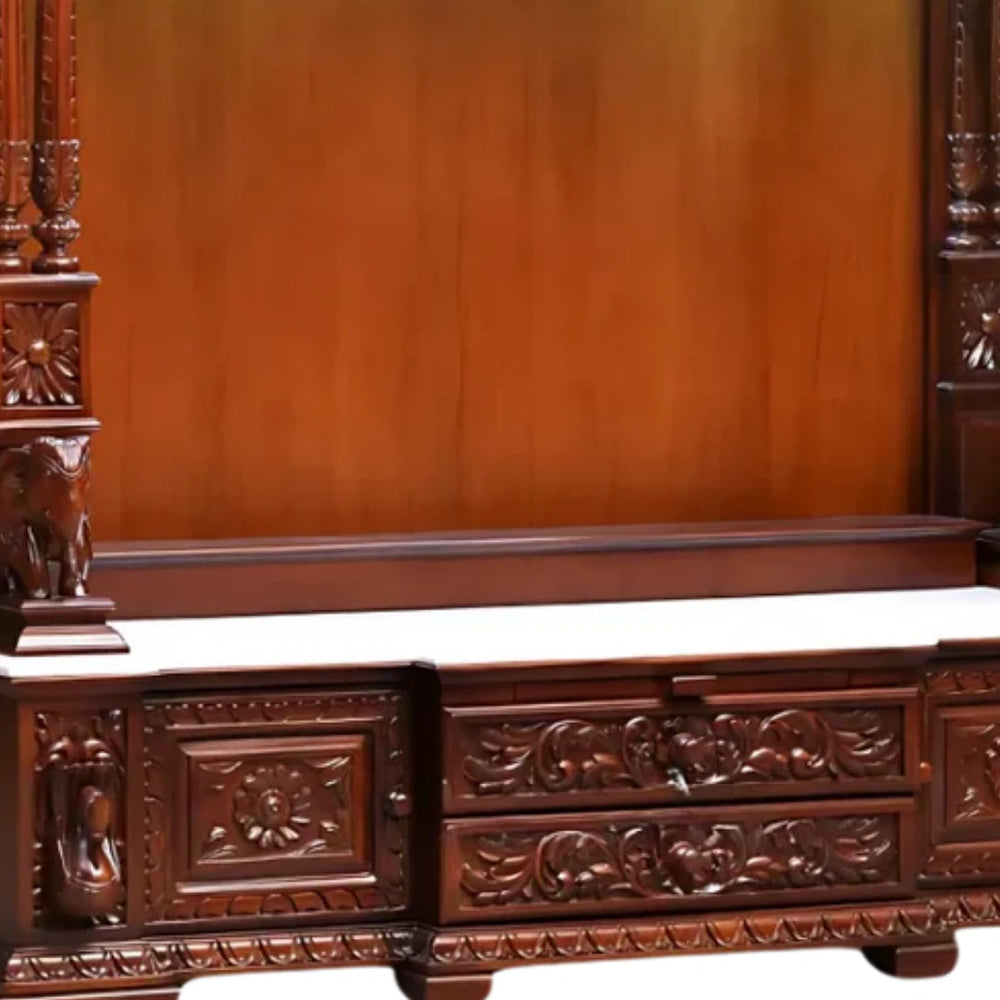 Aarunya Teak Wood Mandap by DZYN Furnitures is a beautiful and big temple made of pure teak wood. It is dark brown in color and looks very grand. This big home temple has a magnificent spire, hand-carved arch, dome-like side pillars and beautiful lattice panels. A large drawer is also provided below in which all the puja items can be kept. This big size wooden temple is very strong and has a length of 54 inches, a width of 23 inches and a height of 70 inches. This temple is perfect for large mandir for home. Its glossy finish and strong base make it special. Just a dry cloth is enough to clean it. People searching for large pooja mandir will definitely like it. Peace and devotion will overflow every corner of your house while worshipping in front of this big home temple for home.