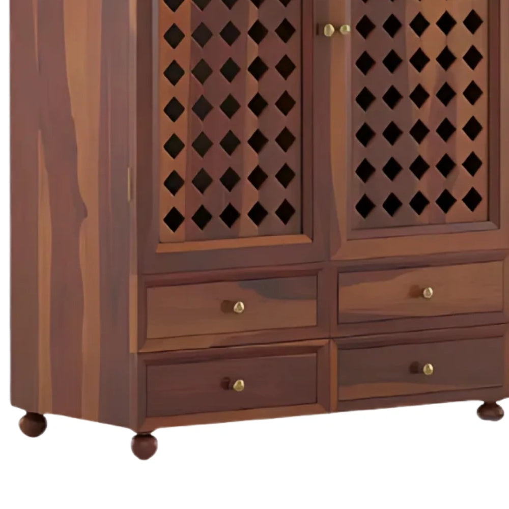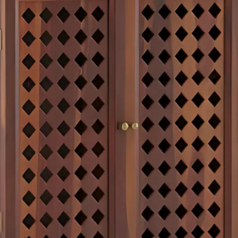 The double doors have a neat diamond-shaped jaali pattern that gives a semi-open view. This design lets air pass while keeping the idols slightly covered. The pattern is the same on both doors which makes the mandir look balanced. The teak color of the doors matches the rest of the unit and gives a clean look. You can keep the doors half-open during daily pooja. The design also lets light create soft shadows inside. The jaali is easy to clean and does not hold dust. This pattern gives both privacy and a light open feel at the same time.