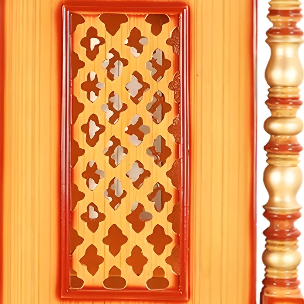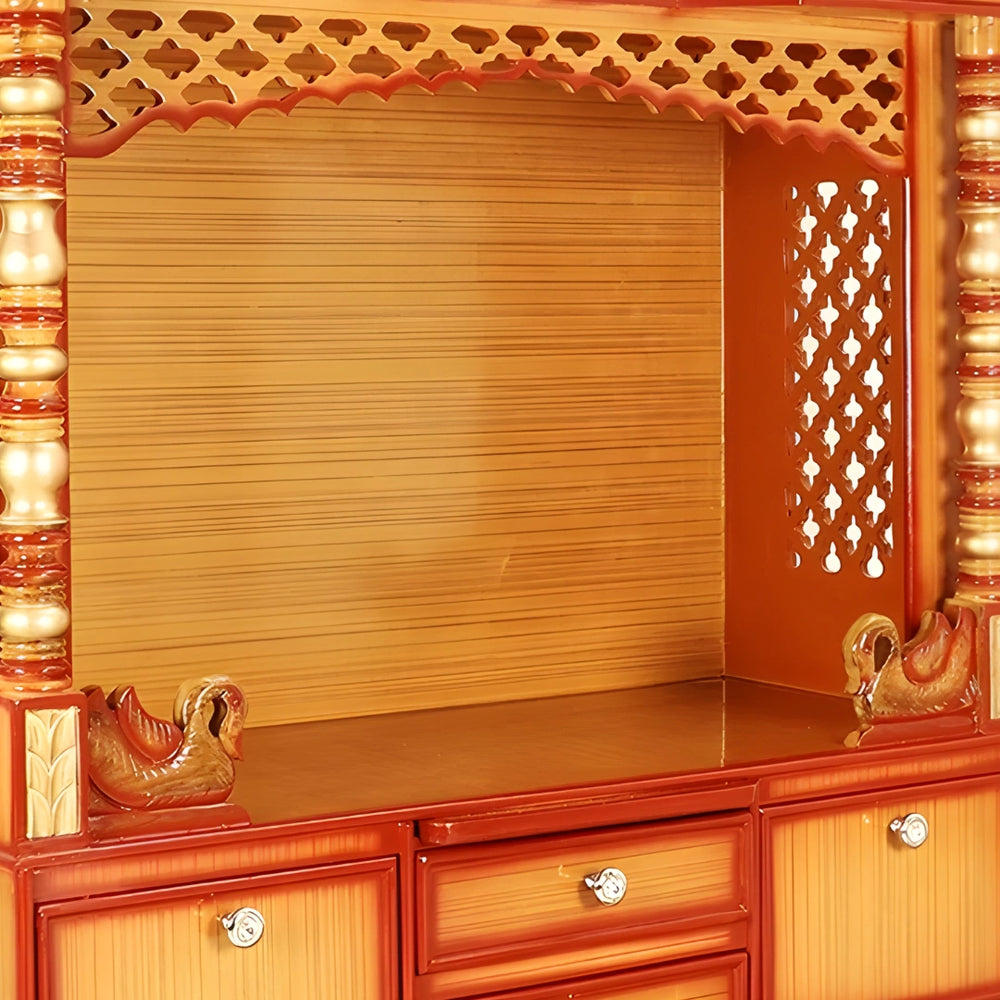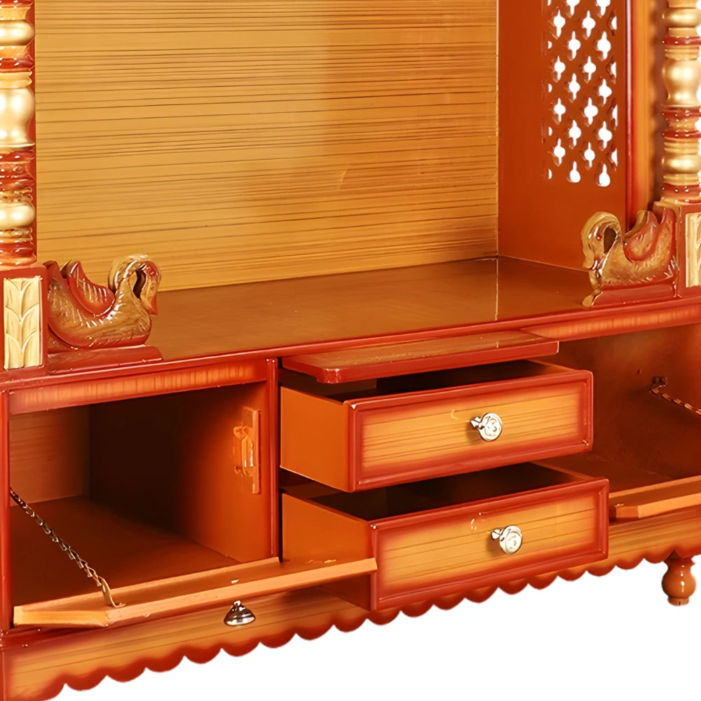The Abhikya Kostha Pooja Mandir is a handcrafted wooden temple that adds an elegant and traditional touch to your home. The high-quality wood used in making this temple has a rich, glossy polish that highlights the natural grain of the wood and gives it a warm, inviting look. The finely carved swans on the pooja area add grace and charm. This makes the pooja area stand out, making it a true masterpiece among wooden temples for your home. The spacious storage drawers at the bottom of this wooden temple are another nice feature. They offer a useful area to arrange all of your pooja things, keeping everything neat and organized. The mandir's elaborate lattice work on the sides adds to its visual appeal and makes it the centerpiece of the home. Furthermore, its solid foundation and long-lasting design ensure that this wooden temple will be valued in the home for many years to come. The teak-gold color combination enhances the look of this wooden temple. The mandir enhances the spiritual atmosphere of your pooja area and is a lovely addition to any house, not simply a place of worship.