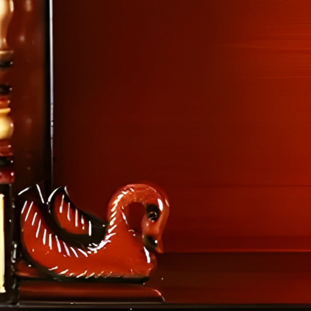 This wooden temple is a beautiful example of fine craftsmanship. It has been skillfully crafted by artisans, with all details brought into consideration. The intricately carved swans on the front add much grace and peace to your pooja space. The side jali brings in soft light while enhancing the spiritual atmosphere. The front jali adds to the traditional charm of the temple with its delicacy. This handcrafted wooden temple is a treasured addition to your house because of its meticulous craftsmanship and attention to detail in every element. This temple is a work of art that elevates the spiritual quality of your home.