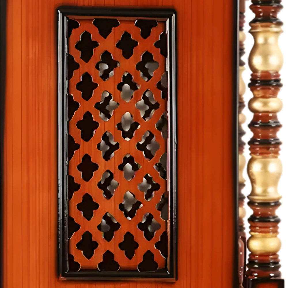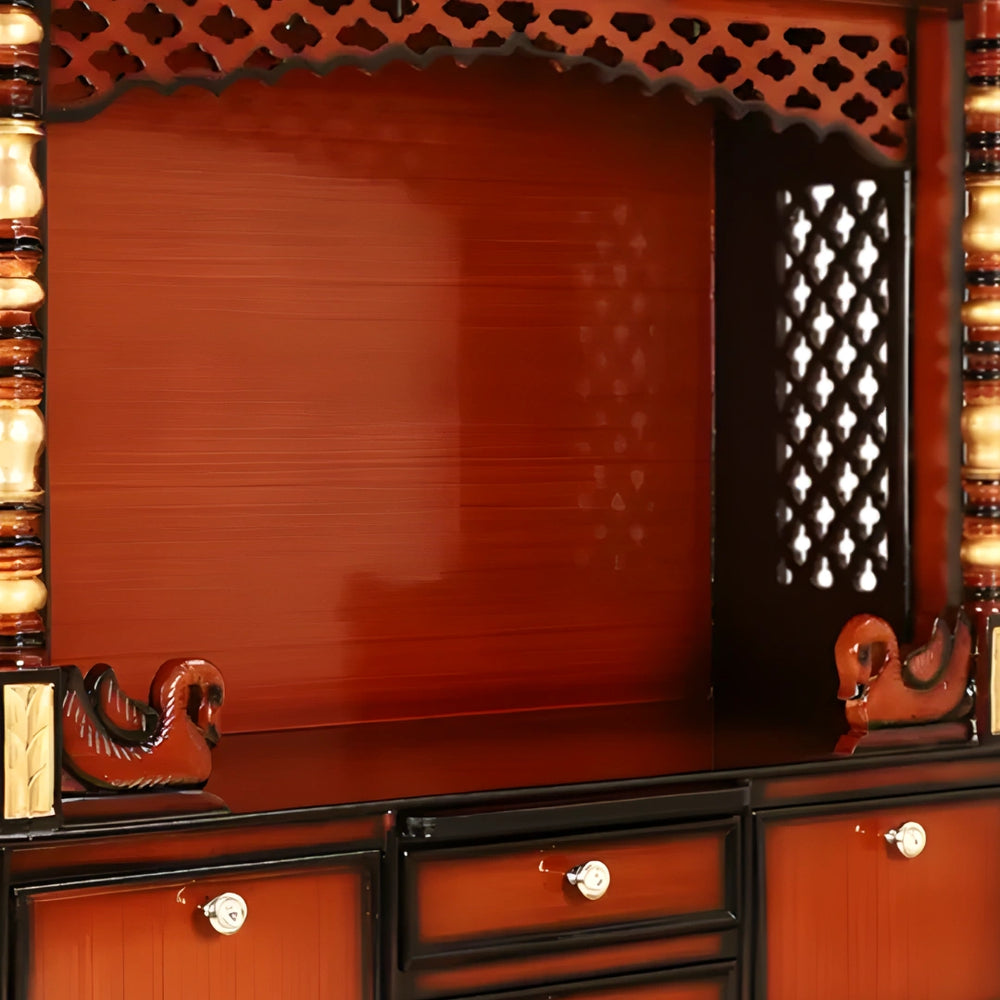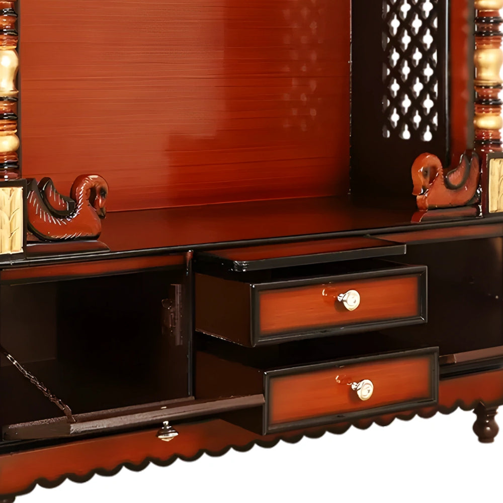 The Abhikya Kostha Pooja Mandir is a handcrafted wooden temple that adds an elegant and traditional touch to your home. The high-quality wood used in making this temple has a rich, glossy polish that highlights the natural grain of the wood and gives it a warm, inviting look. The finely carved swans on the pooja area add grace and charm. This makes the pooja area stand out, making it a true masterpiece among wooden temples for your home. The spacious storage drawers at the bottom of this wooden temple are another nice feature. They offer a useful area to arrange all of your pooja things, keeping everything neat and organized. The mandir's elaborate lattice work on the sides adds to its visual appeal and makes it the centerpiece of the home. Furthermore, its solid foundation and long-lasting design ensure that this wooden temple will be valued in the home for many years to come. The temple enhances the spiritual atmosphere of your pooja area and is a lovely addition to any house, not simply a place of worship.
