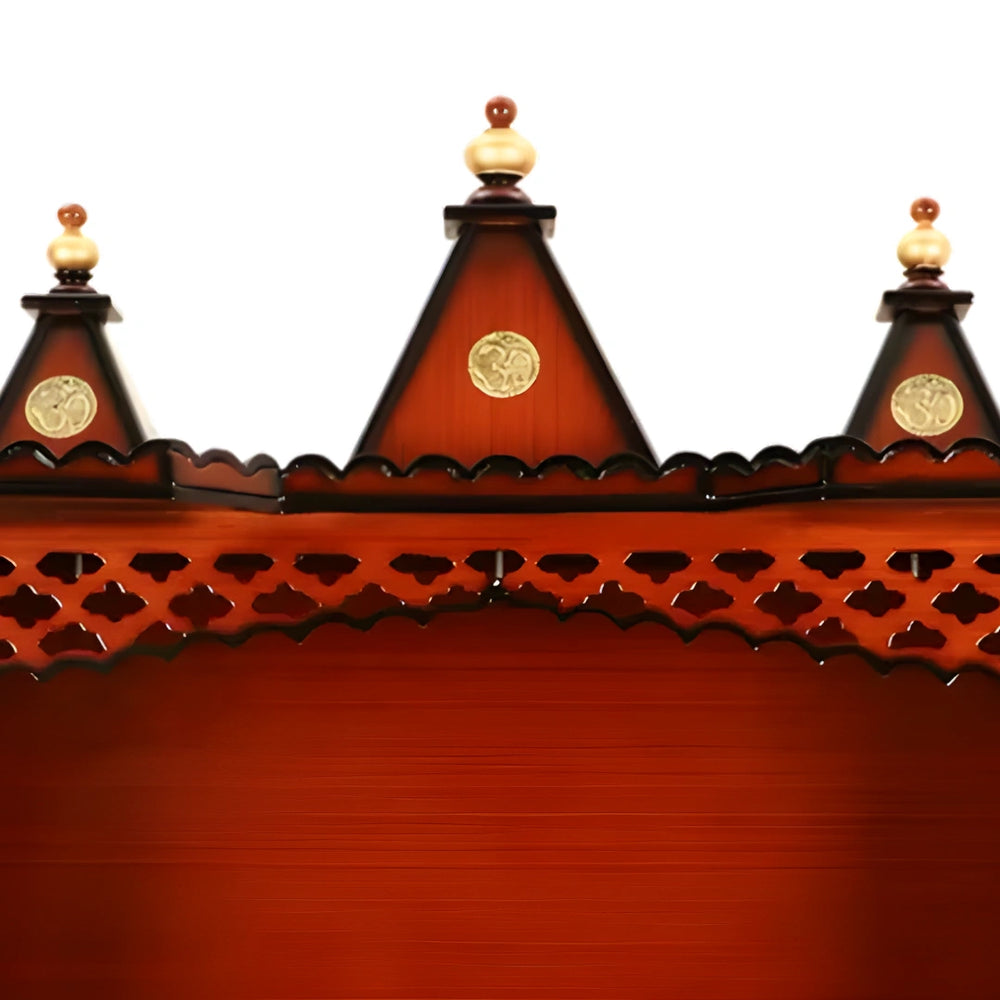 The three-dome design of this wooden temple adds a unique architectural feature to this pooja mandir. Every dome is expertly crafted to represent spiritual elevation and to add a traditional element to the temple's overall architecture. Domes are considered to balance the energy of a structure. The domes on top of the mandir are a symbol of the place of God in Heaven. The shikharas of the mandir resemble the famous Hindu temples including Jagannath Temple and Akshardham Temple. This wooden temple is a beautiful and significant addition to your pooja room because of its three-dome design, which captures the spirit of ancient Indian temple architecture.