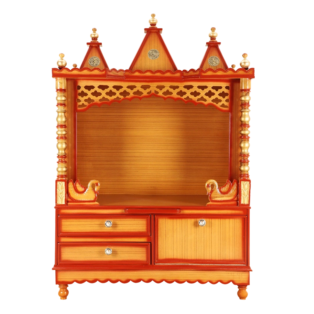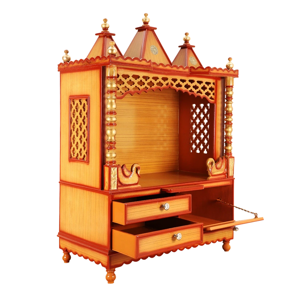 The Abhikya Sthana Wooden Temple is a beautifully crafted piece designed to bring peace and spirituality to your home. Made from high-quality wood with a rich teak finish, this temple adds a serene atmosphere to your space. The three domes on top of the temple enhance its visual appeal and hold spiritual significance. The side panels have intricate jali work that allows soft light to pass through, creating a calm environment. The strong pillars on each side give the temple a timeless charm. The open pooja area provides a clear view of the deities, making it easier to connect during prayer. The raised platform features ornate swan sculptures that enhance its elegance and draw attention to the deities. At the base, there are two spacious drawers that provide convenient storage for pooja items, ensuring everything is neatly arranged and easily accessible.