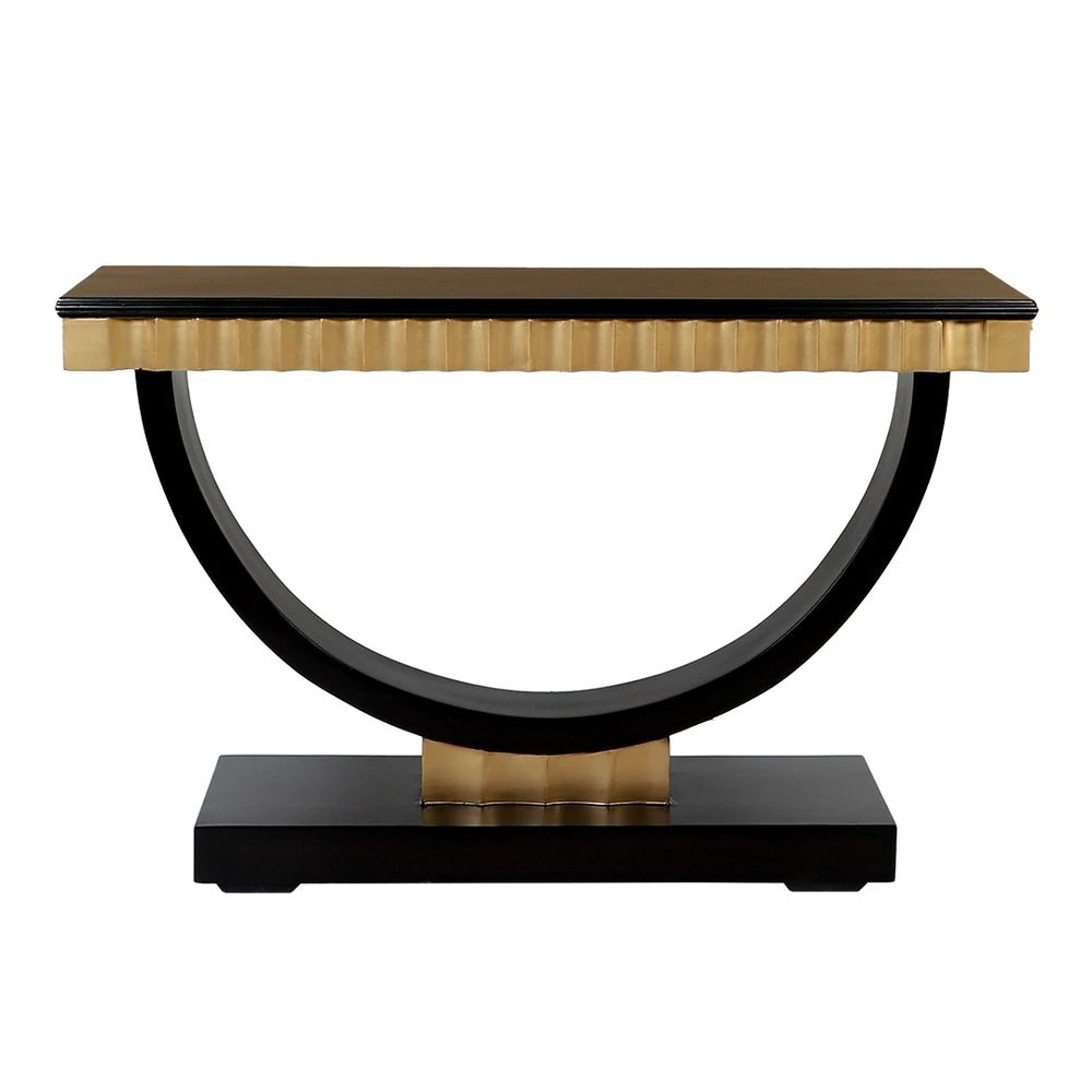 This table combines both visual appeal and stability, making it both a decorative and practical addition to your home. The U-shaped base offers firm support while creating a striking design element. Its sturdy construction ensures that the table remains secure when used for placing heavy items or decorations. The sleek and stylish look of the console table enhances the overall decor of any room. It fits well into various spaces while maintaining its functional role as a surface for household items. The design adds character to a room while still being practical. This makes it a durable choice for everyday use.