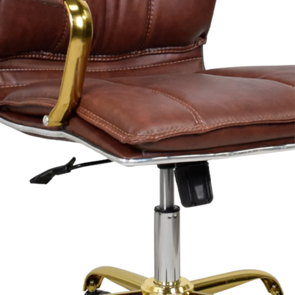 This office chair has a neat design with vertical stitch lines on the backrest that make it look smart and well-shaped. The brown artificial leather gives it a rich and elegant look, making it good for both formal and semi-formal office spaces. The backrest has a natural curve that looks balanced and gives good support to your back. The seat has double layers of cushion which look soft and comfortable. The gold finish on the armrests and base adds a shiny and stylish touch. The chair has clean lines and a simple shape that give it a modern executive feel. The design is simple and fits well with other office furniture.