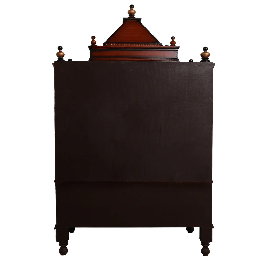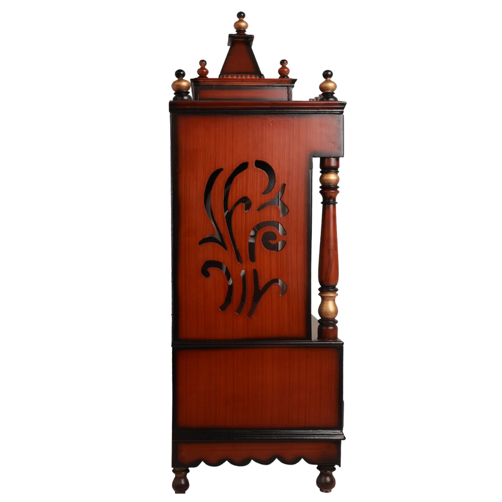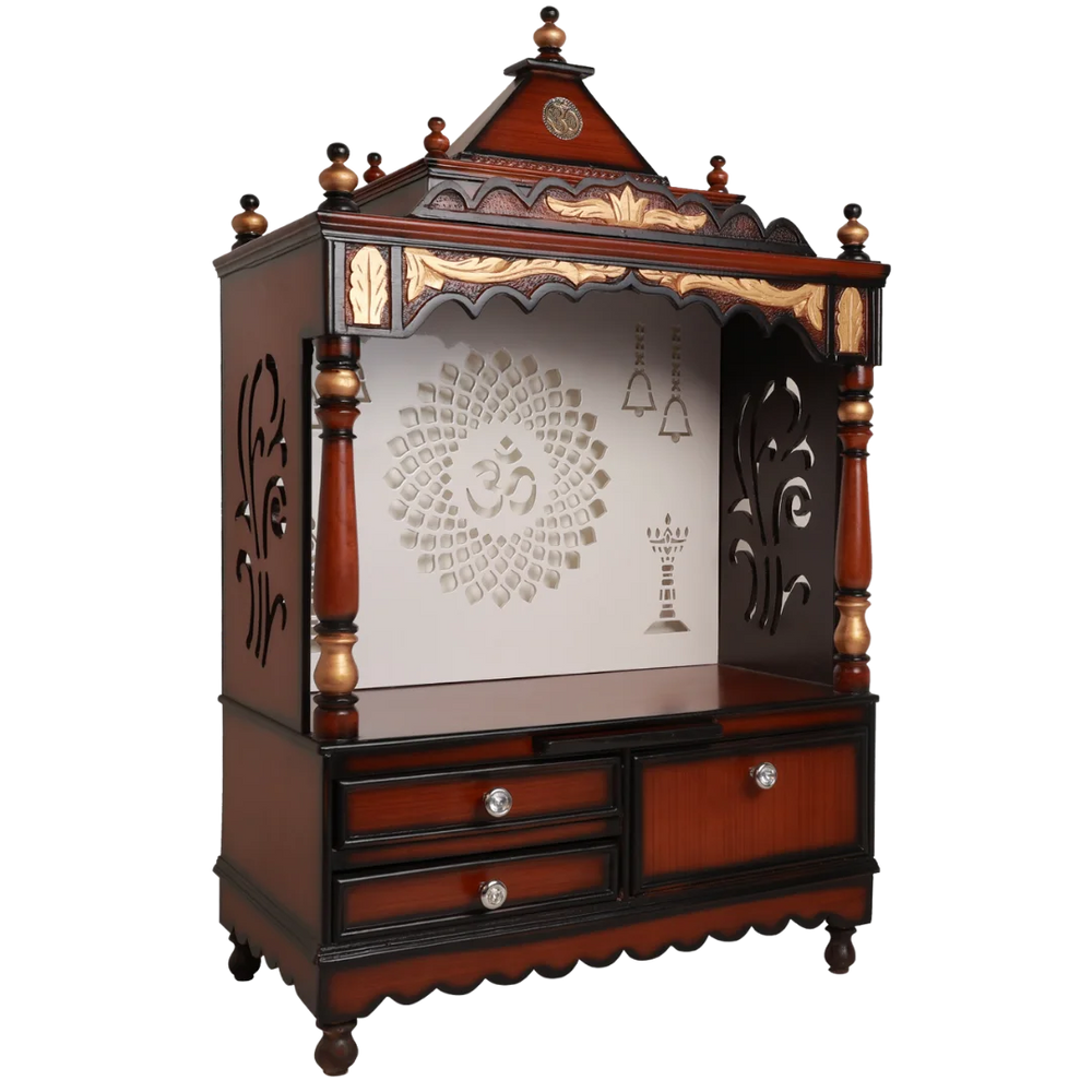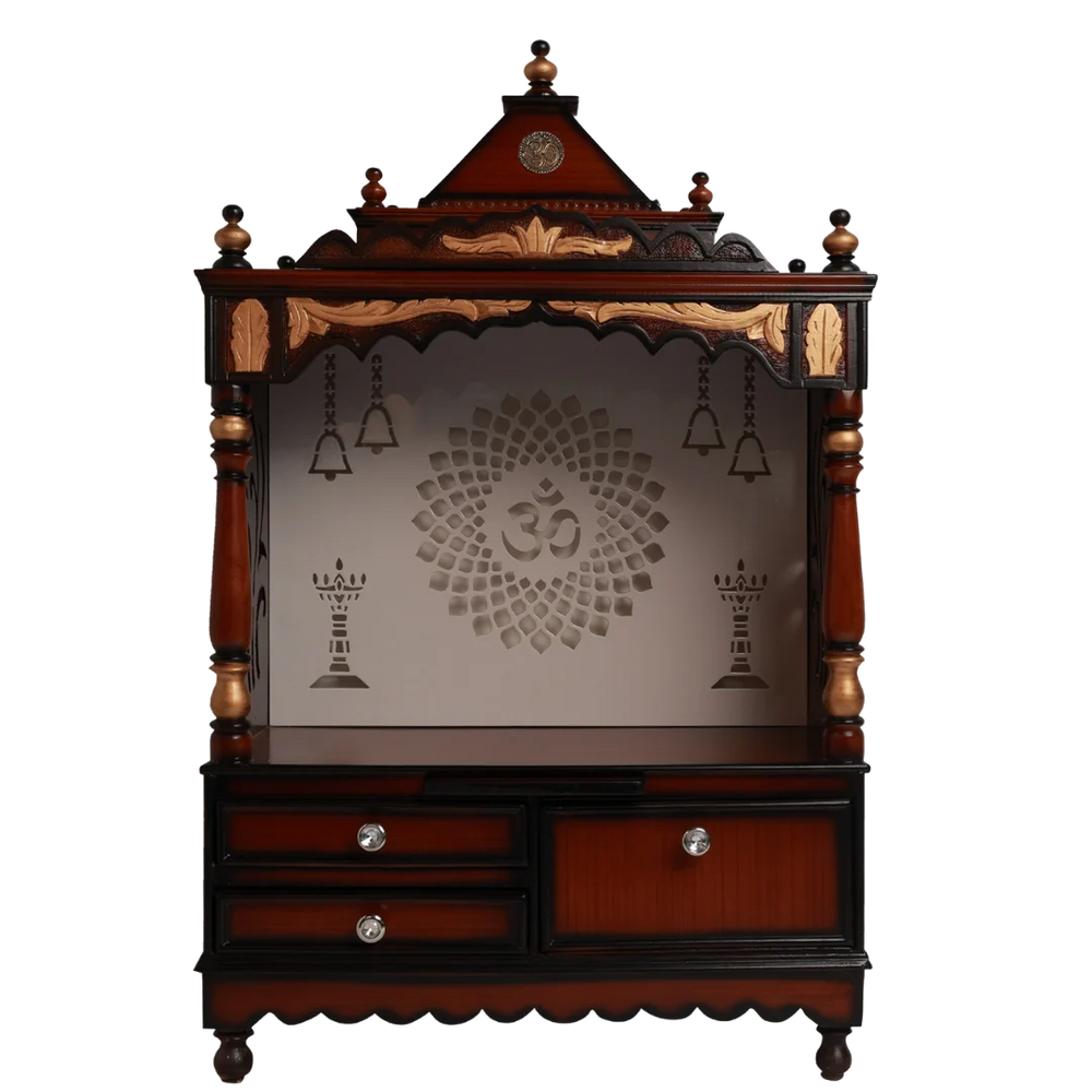 This beautiful 4 feet pooja mandir is a combination of functionality, beauty, and traditions. It is a mark of your devotion and faith and a place to find peace of mind and happiness. This beautifully crafted medium-sized mandir for home has intricate floral patterns and elegant carvings that enhance its overall appeal. A dome on top with the traditional OM symbol adds a royal and sacred touch. The smooth brown and gold finish complements the natural beauty of the high-quality teakwood. The spacious drawers below the altar provide ample storage for all your pooja essentials, such as prayer books, incense sticks, and diyas. The jali design on the back panel allows light and air to flow freely, creating a positive and divine ambiance. The detailed carvings on the sides and front further enhance the beauty of this 4 feet pooja mandir. The sturdy base ensures that the mandir is durable and capable of handling the weight of multiple idols. This pooja mandir is a design of traditional architecture-based Indian temples in modern taste. It has an awesome brown and gold color combination that makes it look great when added to any home.