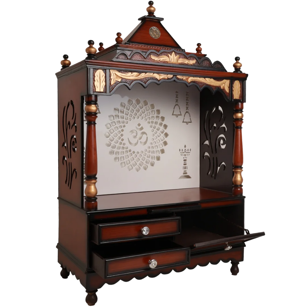 This teak gold pooja mandir provides ample storage for all your pooja essentials. The spacious pooja area is designed to comfortably hold multiple idols of gods. The storage solutions include two well-sized drawers, perfect for storing incense sticks, diyas, prayer books, and other smaller items. Below the drawers is a bottom compartment, which offers enough space to store larger pooja items such as lamps, incense holders, and more. The knobs on the drawers are elegantly designed, ensuring smooth opening and closing while adding to the beauty of the mandir. The smartly designed storage keeps everything organized, maintaining a neat and elegant look for your pooja space.