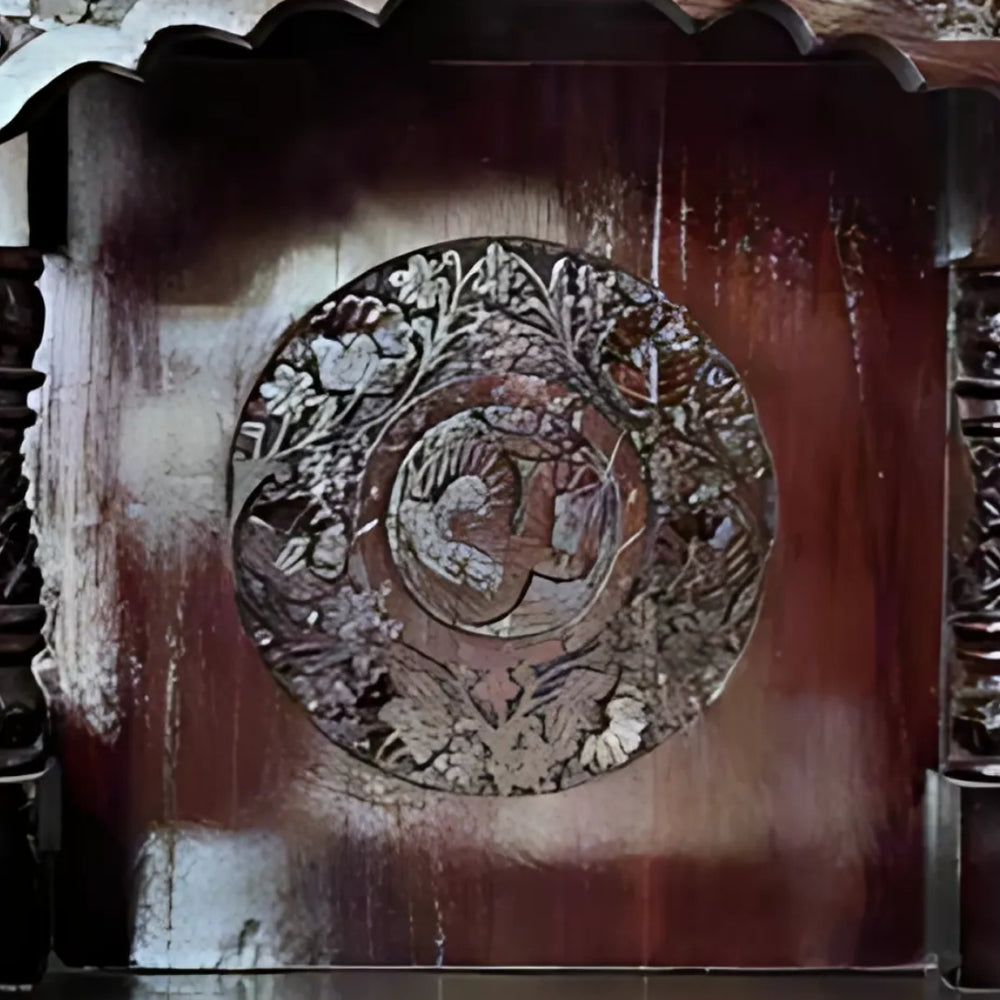 This home temple has a detailed floral carving on the front arch that increases the texture and beauty. The delicate patterns on the frame provide a smooth conventional feel to the entire appearance. The arch is curved, which makes it graceful and gives it a smooth transition with the crown. There are carvings along the edge of the arch which add beauty to it. The shade of brown color contributes to the depth and outlines the patterns clearly. The frame gives the wooden temple a defined front structure. The floral design represents detailed workmanship and adds balance to the upper and lower parts. The shape of the arch keeps the temple look complete and well-finished.