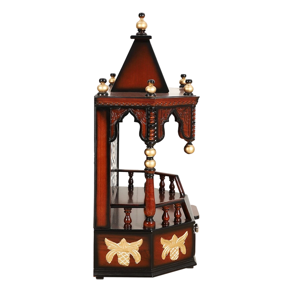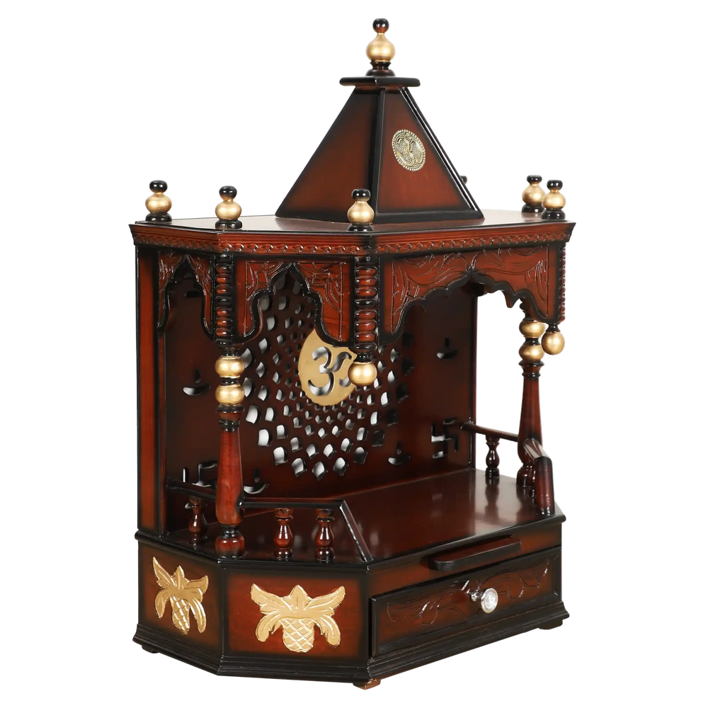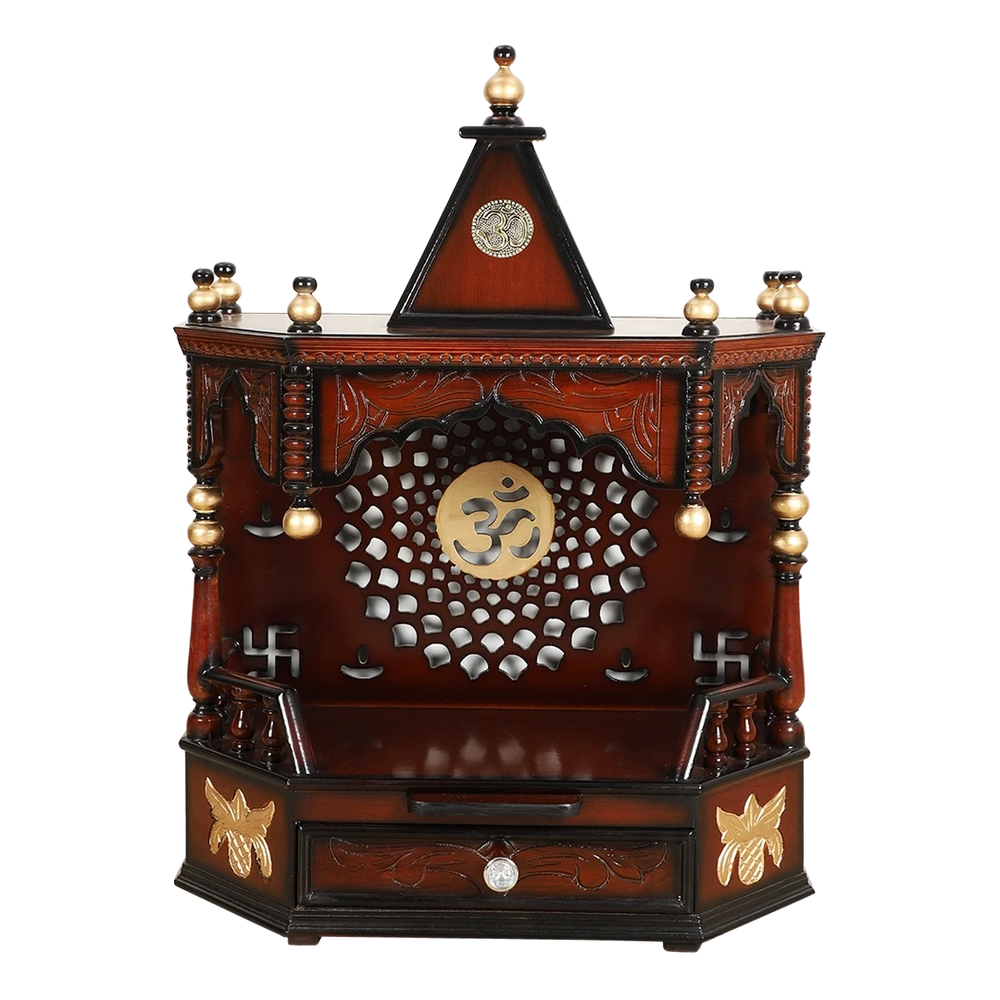 Focus on functionality: We ensure that the wall mounted mandir is not only a decorative piece but is also extremely functional. Therefore, along with the intricate carvings on the sides of the wall mandir and its gold-accented pillars and the Om symbol we have also included a spacious drawer into the mandir design in wall to keep your small temple for home organized and store your puja essentials out of sight when not in use.