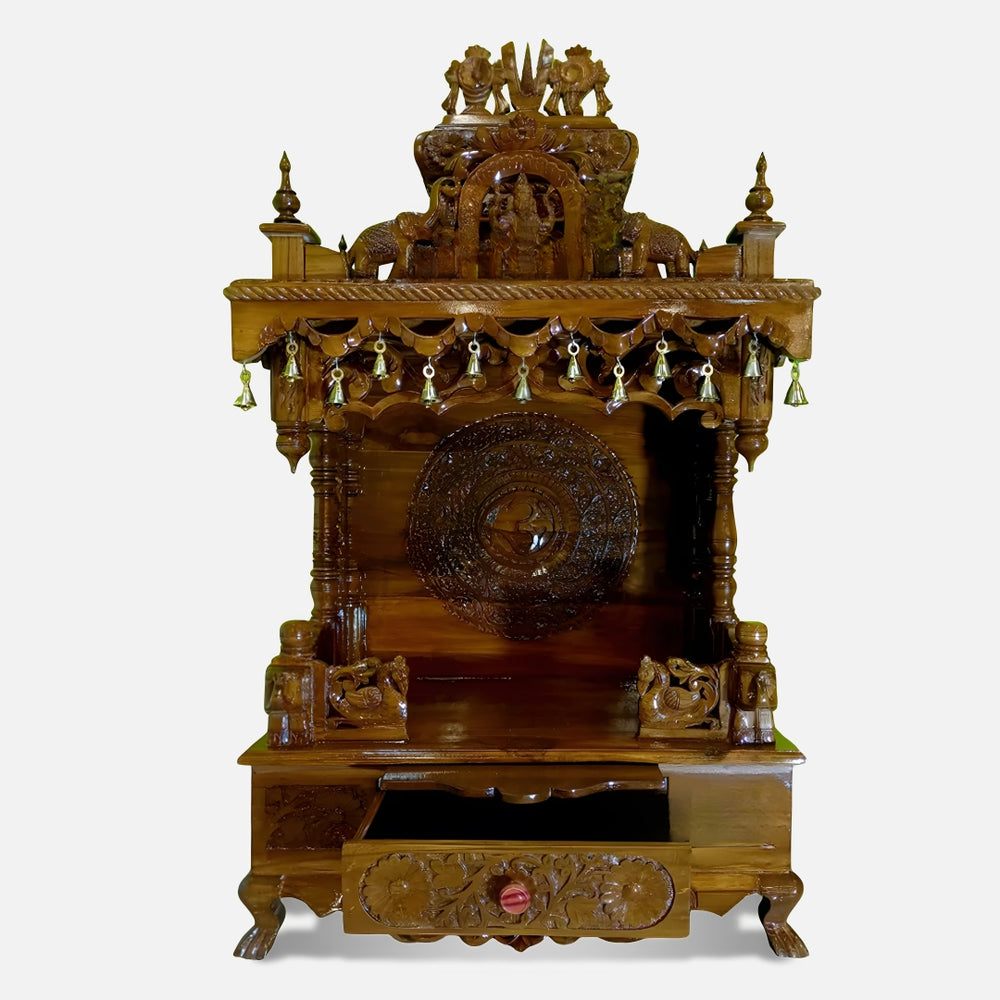 The Aishani Wooden Temple is a beautifully handmade mandir built from high-quality teakwood and finished in a rich brown color. It brings a calm and devotional feeling to your home and gives your pooja space a pure and graceful look. The front part has fine carvings, hanging bells, and a detailed deity panel that together create a peaceful spiritual focus. The carvings on the pillars and base add beauty and also keep the structure strong for long use. The top section has a crown-style design with neat patterns that look like real temple architecture. The base has a smooth drawer that helps you keep pooja items like incense, cloth, and diya wicks neatly in one place. The natural wood lines are emphasized with the brown polish and make the temple look timeless with the soft shine. All sections of this mandir are created to bring beauty and functionality together. The Aishani Wooden Temple is a great addition to your home, with its beauty, tradition, and piety which is ideal to use on a regular prayer basis and during festivals.