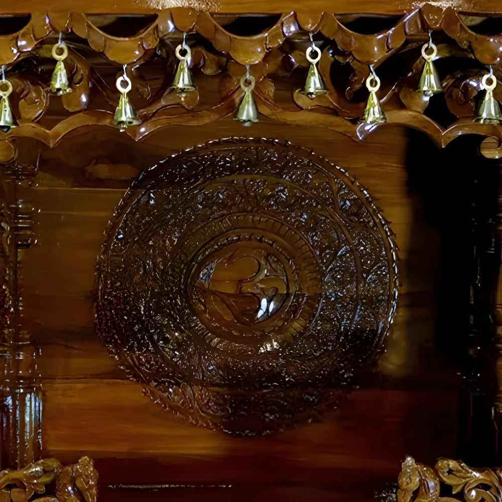 There are small golden bells attached to the corner of the front canopy of this wooden temple that produces a peaceful, devotional appearance. The bells fit perfectly well with the elaborated carvings and create an ideal combination of beauty and spirituality. The golden hue is semi-luminous on the brown wood and it gives the mandir light. The combination of them brings a peaceful and holy atmosphere in your pooja room. The bells have a gentle and lively touch due to the light motion. Such a simple but detailed design demonstrates good craftsmanship and links the upper section of the temple to the entire structure in a beautiful way.