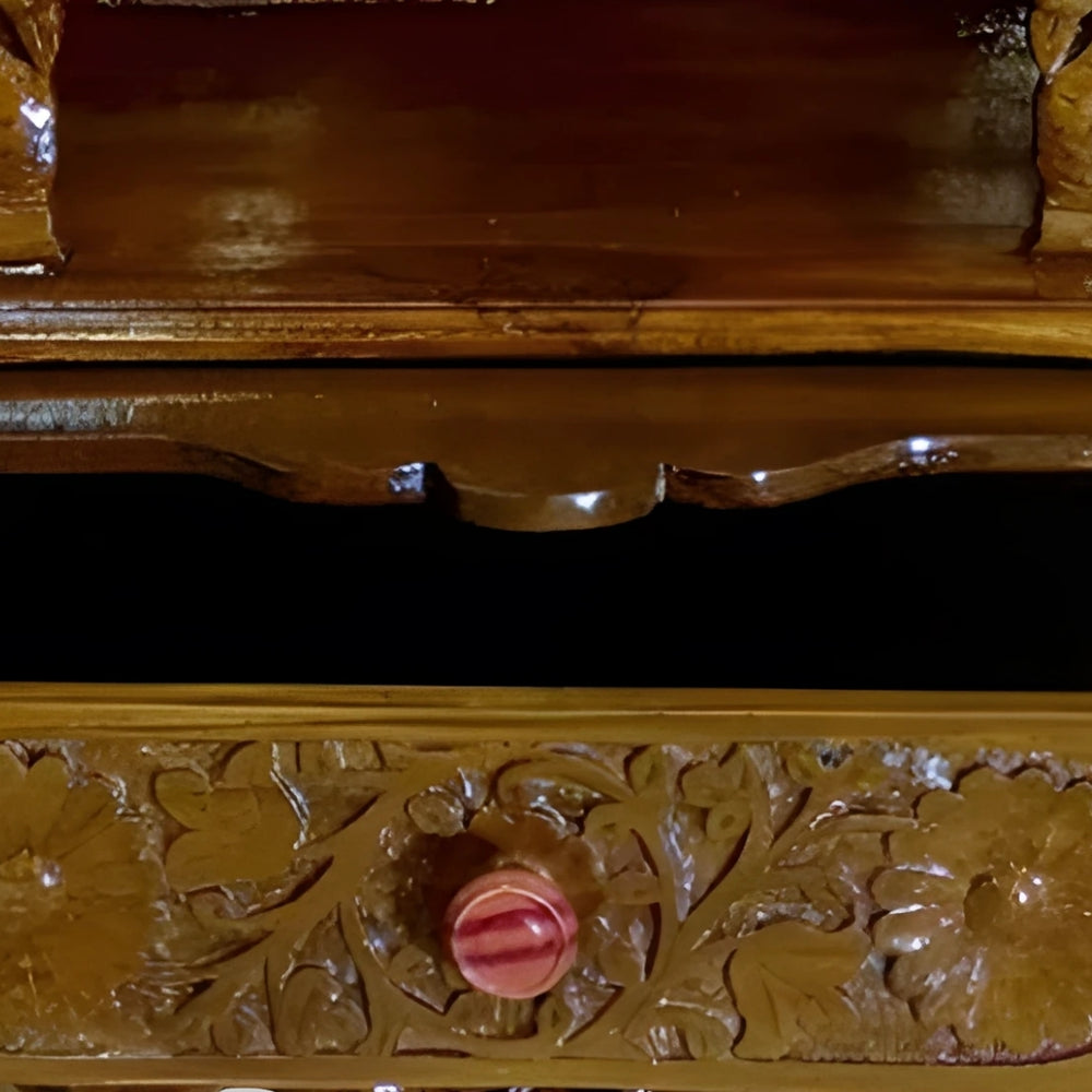 This pooja mandir has a carved front floral design drawers at the bottom of the base, which is beautiful. It is spacious to store all the daily pooja materials such as incense sticks, cloths and diya together. The flower carvings show fine handwork that matches well with the rest of the temple design. The even pattern keeps the look neat and graceful. The carved legs below the base give it a traditional temple look and make the structure strong. The brown polish shows every small detail and gives a smooth shine. This part of the mandir is useful and looks beautiful. The strong base keeps the temple firm and graceful for many years.