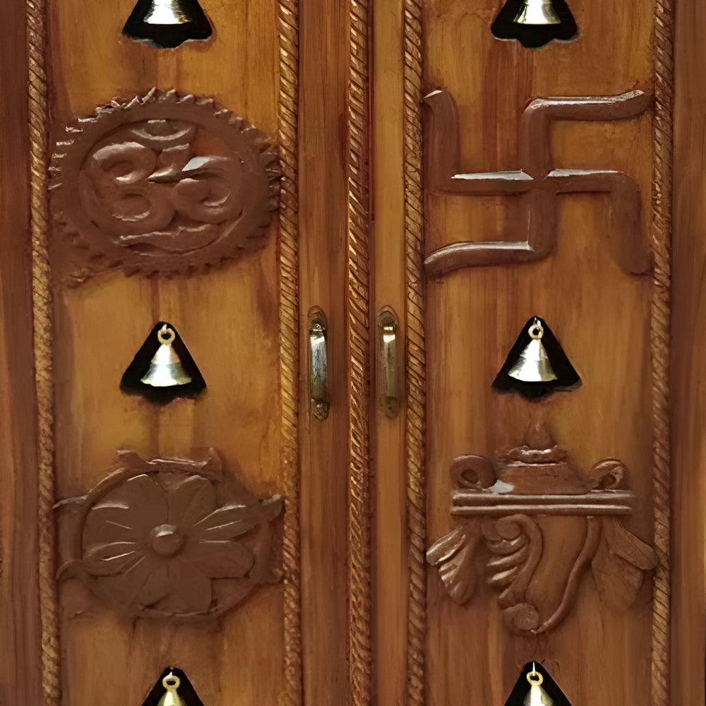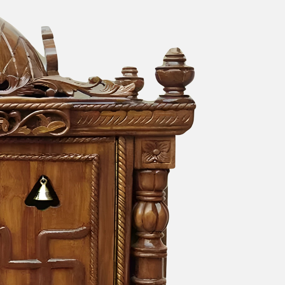The carved doors are embellished with religious symbols such as Om and swastik, forming a godlike entry of this pooja mandap. These details are so elaborate that they showcase the richness of culture besides adding the spiritual essence to your room. The inner sanctum is not only safeguarded by the doors but also the doors provide the mandap with an elegant look. Their designs are a classical masterpiece, which makes them the center of attention even during the times of their closure. This architectural feature enables the doors to be useful and ornamental, and adds more tradition and beauty to the identity of this large size wooden temple. They are a perfect combination of spirituality and design expertise.
