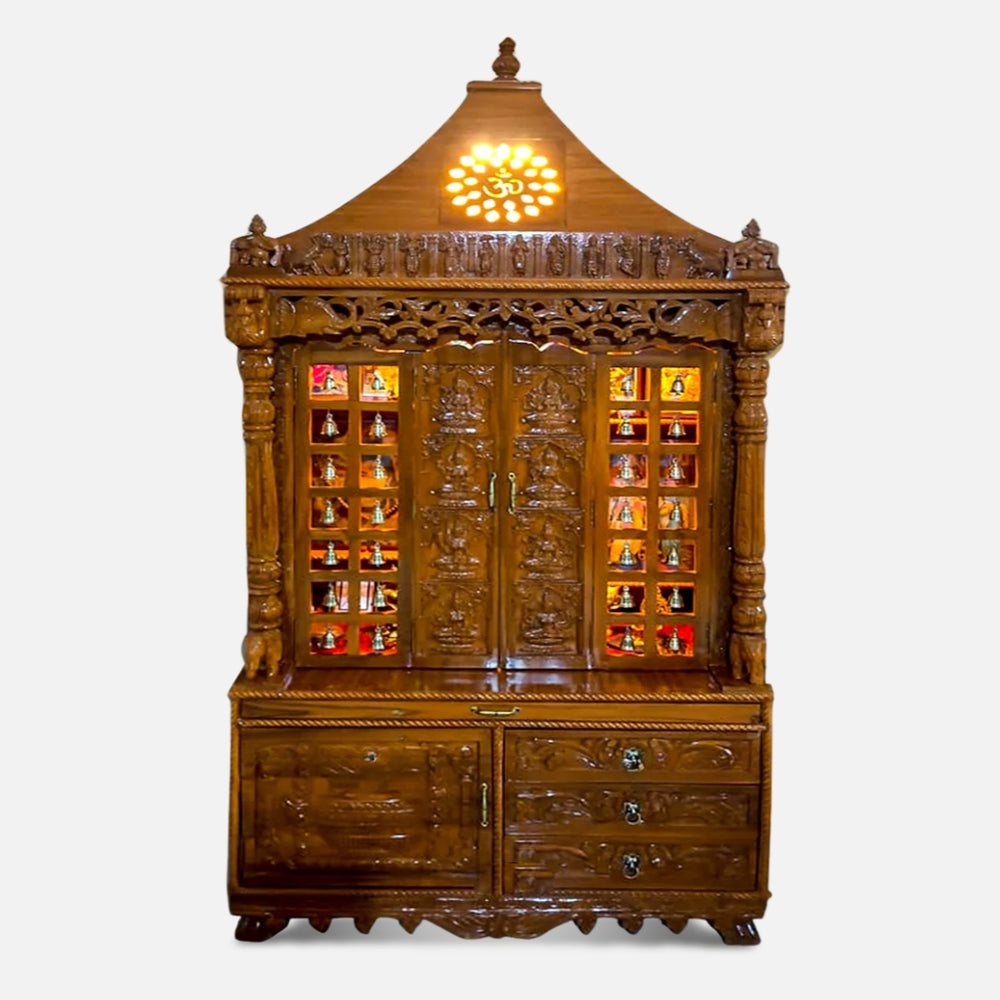 The Ameya Teak Wood Mandap with Door in teak color is a big pooja mandir that reflects a traditional temple style. The design has a tall structure with a sloping shikhara that gives a majestic look. At the top, the mandap has an Om cutout with lighting that glows during daily prayers. The upper section is decorated with carved borders and figures which highlight the richness of the design. The two huge front doors are sculpted with figures of deities and are surrounded by small cutouts which allow the light to flow through in a lovely manner. The available space is large enough to place several idols to conduct a daily pooja inside. The base has drawers and cabinets to ensure the pooja is kept in a systematic manner. The carvings on the doors, the borders, and pillars are well detailed giving grace to the entire design. This 6 feet pooja mandir in teak color blends devotion with craftsmanship and makes a sacred centerpiece for any prayer space.