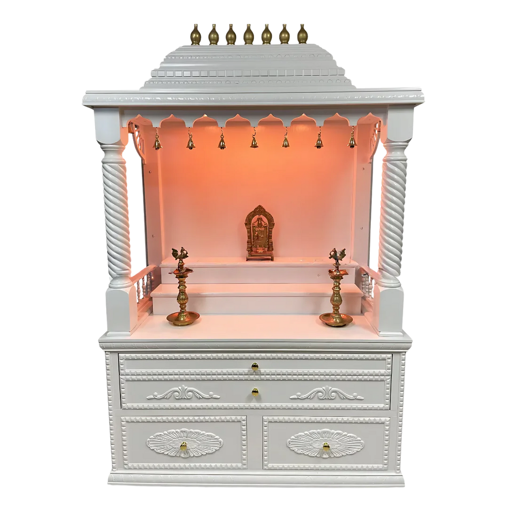 The Amrita Mandap in white color is a striking blend of tradition and purity, designed as a big mandir for home with elegant proportions and subtle detailing. This pooja mandap stands tall with clean lines, ornate drawer work, and carved pillars that elevate its traditional appeal. The bright white color complements a serene worship setup, adding to the spiritual ambiance of your home. The layered dome with carved top accents reflects temple-inspired design while the inner orange lighting adds warmth to the idol area. Perfectly structured for everyday rituals and festivals, this big size wooden temple is both functional and decorative. It includes wide open space for idols and ample drawers for pooja accessories, books, and essentials. Its balanced layout makes it a beautiful teakwood pooja mandap for large homes, prayer rooms, or community use. Every corner of this piece reflects skilled craftsmanship and thoughtful utility. The white color enhances visibility and creates a calm sacred space to focus on devotion. This mandir brings timeless beauty and modern harmony together in a singular centerpiece for your home.