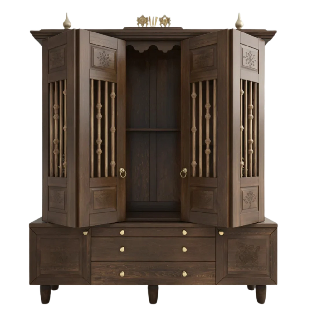 This big pooja mandir is carefully designed by our experts so that it sits at the best height for you to view the deities and focus on your prayers. The Anandam teak wood pooja mandap has long and sturdy legs under the storage space so that you can see the display area for the deities without having to bend down. Because of the jali design, you can keep the deity area secure while still being able to see the deities throughout the day. The perfect height of this home temple gives you freedom to sit or stand when you are praying, You can fully be comfortable and have your daily rituals.