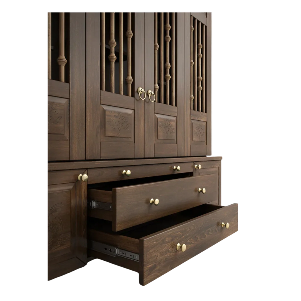 This graceful big pooja mandir is perfectly paired with spindle doors with jali designs. The jali designs on the door and the sides let natural light enter the display area so that the deities can be seen properly, and you get a smooth flow of good energy. Every second spindle on the door has a spiral design that reflects light and creates a calm and peaceful feel during prayers. The door knobs are made with a traditional design that has a distinct handle that brings a timeless look to the big mandir for home. The glossy and bold wood is matched with light and subtle knobs to give a majestic look to the Anandam Pooja Mandap.