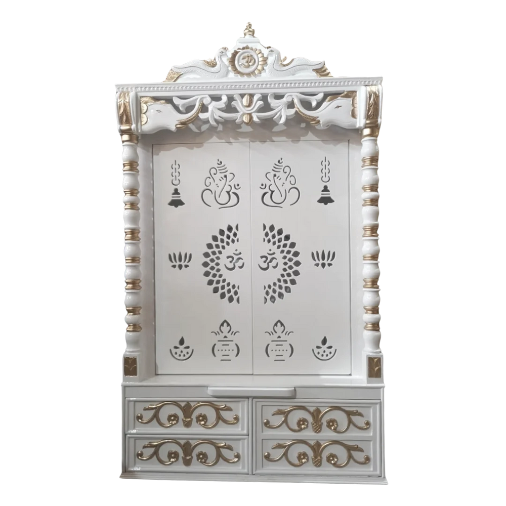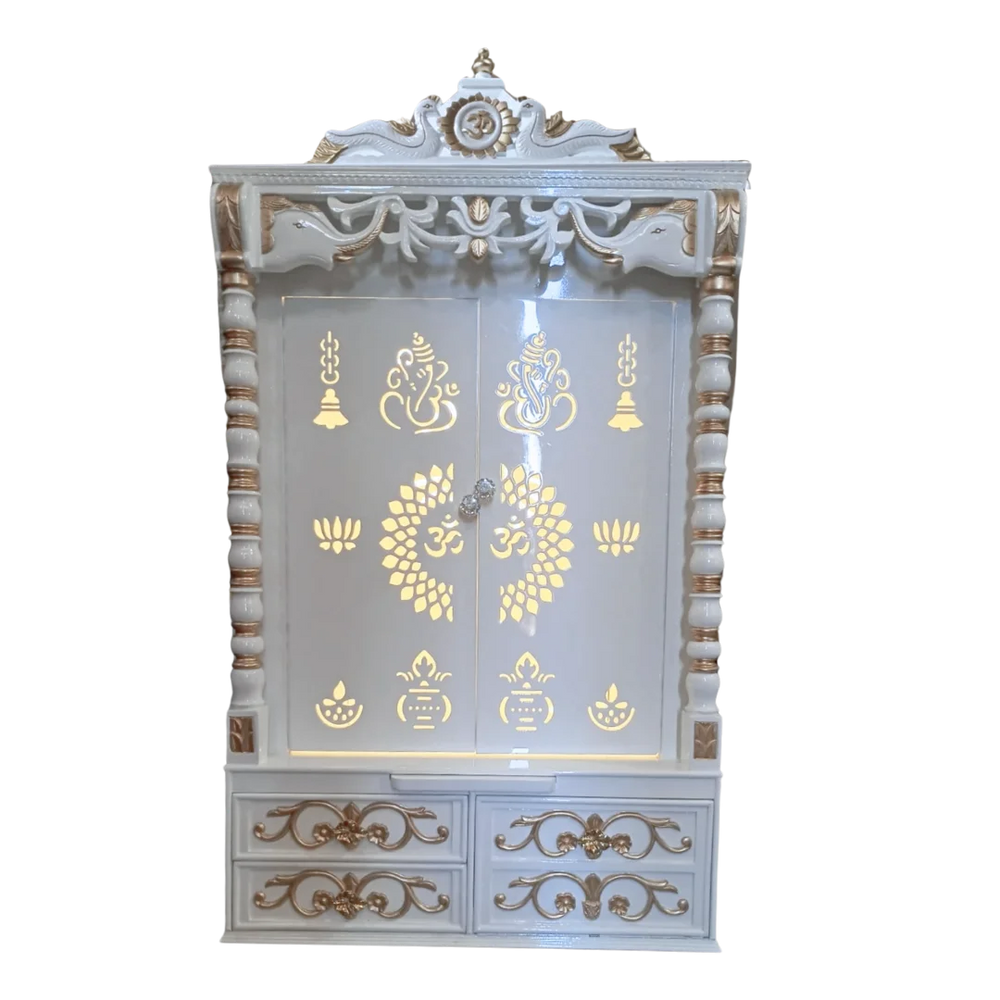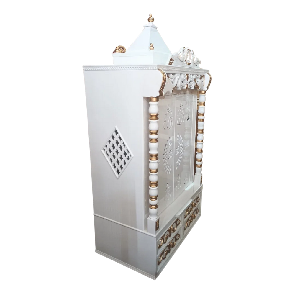 The white color of this mandir gives a peaceful and holy feel to your pooja room. With gold touches, it looks nice and fits well in both modern and traditional homes. The white color shows purity and calmness. Its soft finish mixes easily with other light-colored rooms. Gold lines are added gently on the sides and edges, giving a stylish look without being too bright. The light color helps your idols and pooja items stand out clearly. This is good for places where you want more light and clean look. The white surface also shines better during pooja and makes the space feel bright.