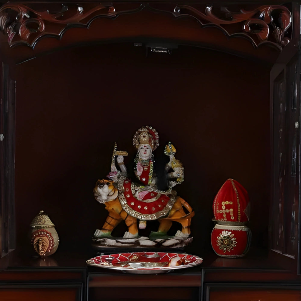 The spacious interior of the Antarusya large floor-rested pooja mandap with door in rich brown color maximises functionality, allowing you to place your idols, the diyas or candles, your offerings, and more. You can place multiple idols in this big mandir for home, making it an ideal piece for collection for families that want to worship different gods all in one place.
