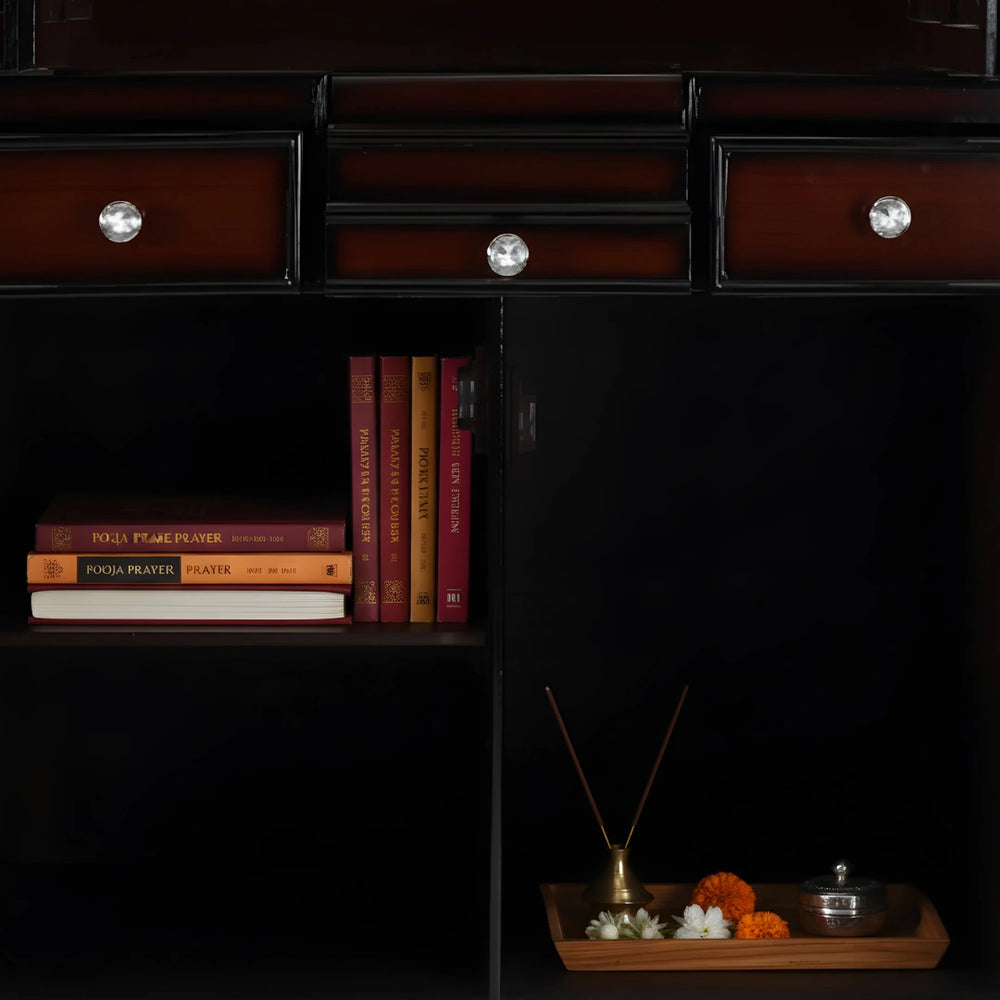 Furthermore, this big mandir for home in brown color also includes an inconspicuous dhoop tray. This has a unique sliding mechanism allowing you to pull it out while in use or push it in and hide it when not needed. This adds further to the functional appeal of the mandir for home big size, making it an ideal choice for any home, traditional or modern.