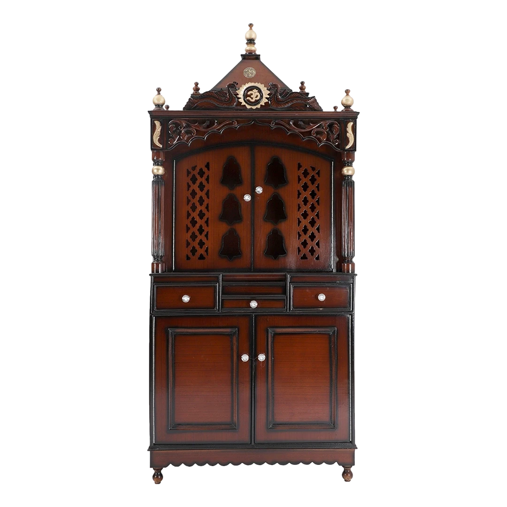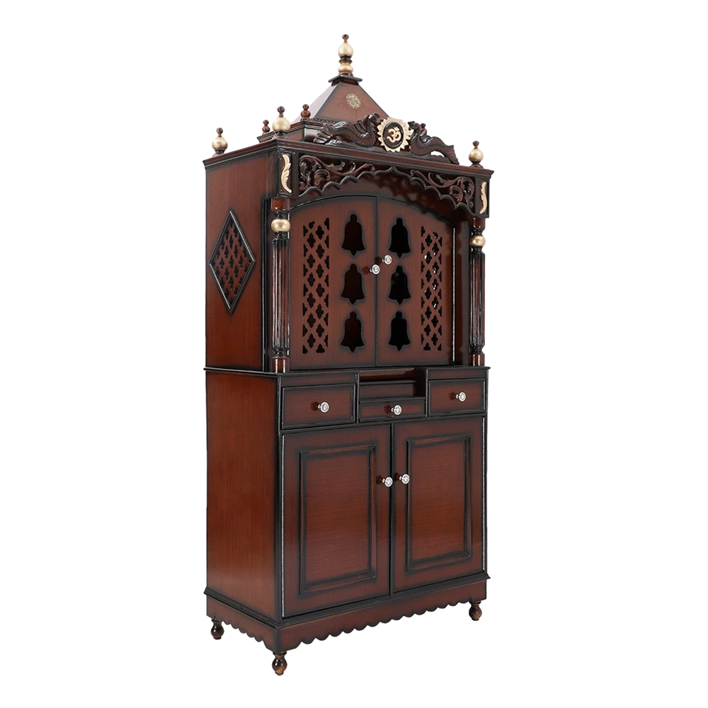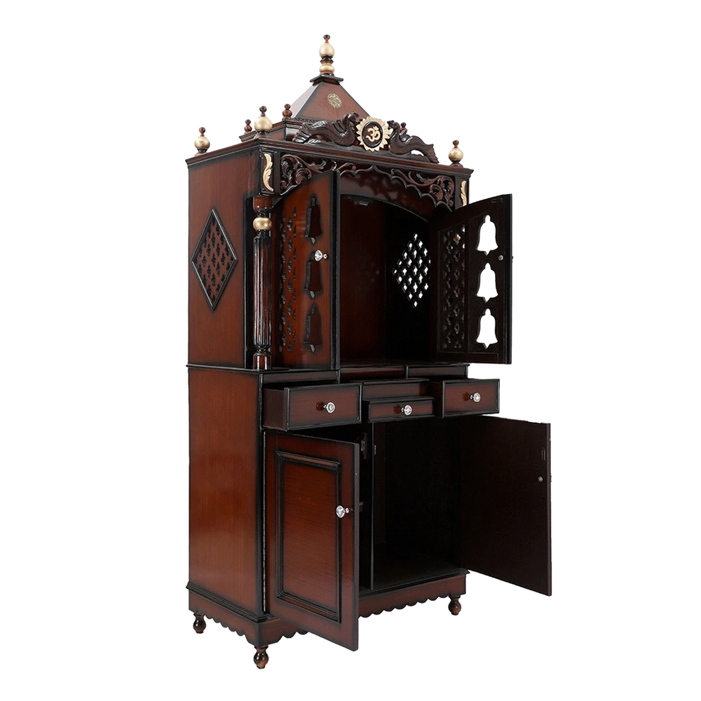 Furthermore, adding to the intrinsic value of the big temple for home is its customizability. You can add a personal touch to the temple by creating partitions in the drawers, installing extra shelves for more storage, installing curtains to the pooja area, or even creating a multi-level platform to put up more deities. The robust nature of teakwood allows modifications to be made after purchase.