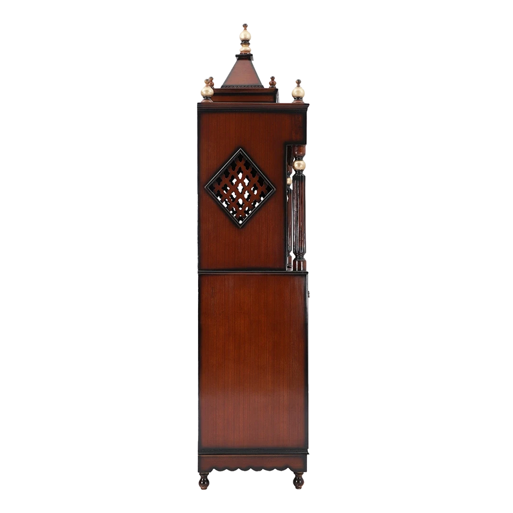The Antarusya 6 feet pooja mandir in brown coloris a perfect display of exquisiteness. The features and embellishments in the mandir design will help you achieve the best experience while being transported to the divine world. The deep brown color and smooth finish of this wooden temple for home big size adds to the elegance of the space with a rustic touch but does not overpower the rich hue and natural grains of the premium teakwood.