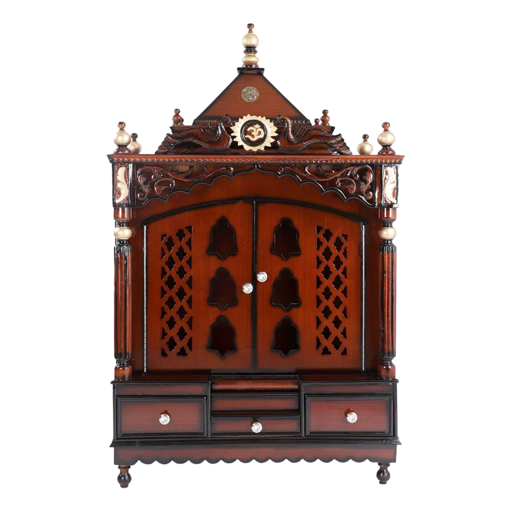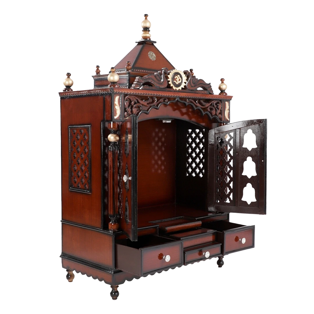 The vibrant color combination of brown and gold is perfectly blended with any kind of interior design from traditional to modern. The Brown gold color blends with earthy and calm tones with a cozy atmosphere.The protective coating gives a natural glossy finish to the wooden temple including four layers of polished paint, which increases the lifespan of the wood. The color of the temple emerges and shines brightly with a touch of metallic gold and silver color to the designs. The diamond-shaped knob gives a lavish look to the wooden temple.