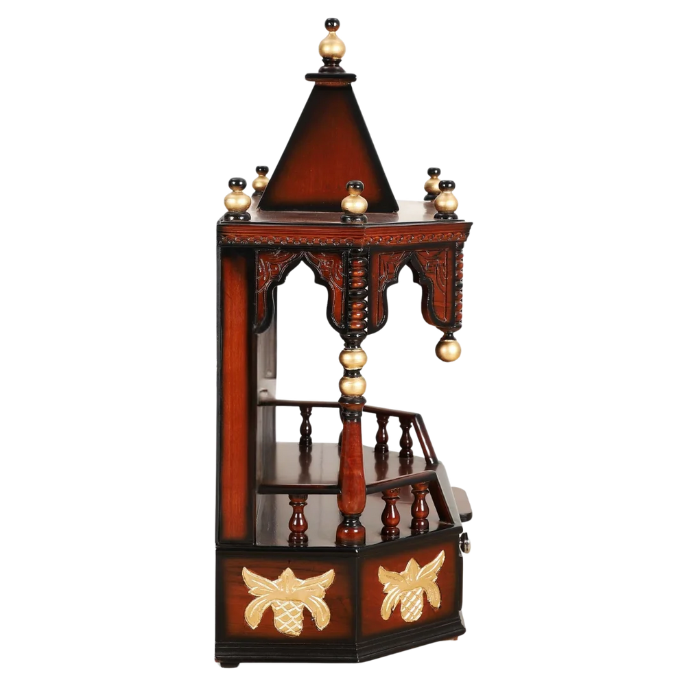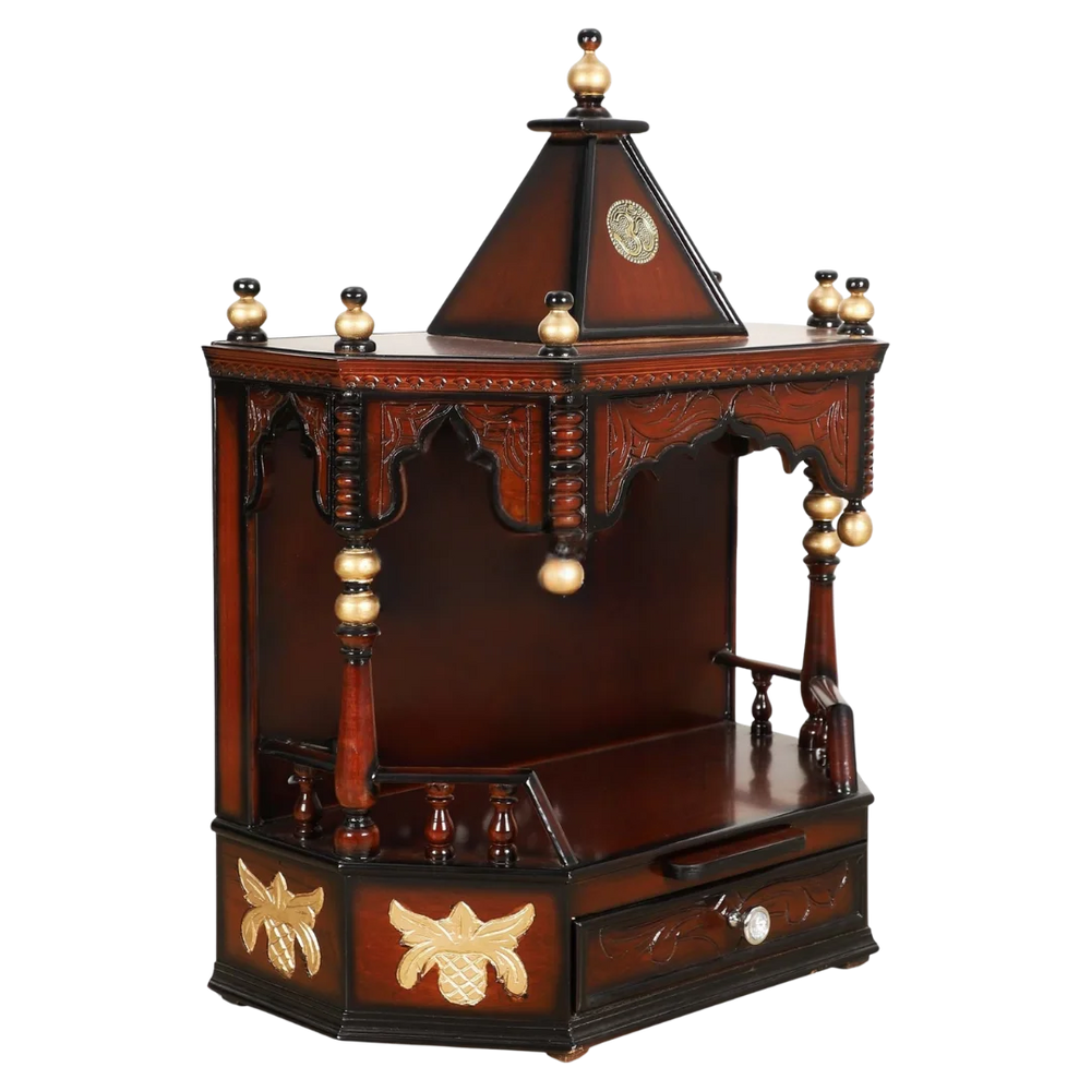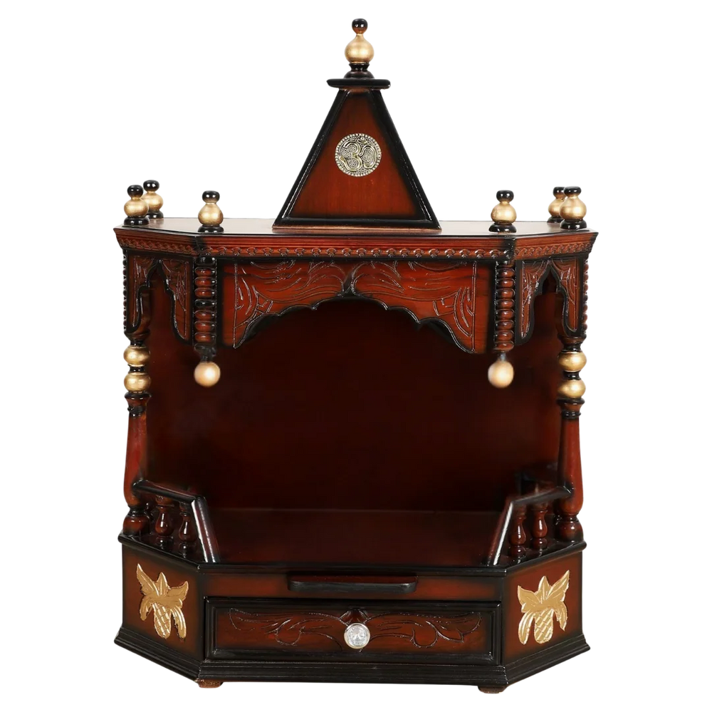The pooja mandir comes with beautiful golden accents that enhance its beauty and bring a touch of elegance to your sacred space. The temple has golden finials that create a striking contrast against the dark brown color to make the design even more beautiful. The golden details pair well with the brown color. It also highlights the design of the temple. Besides being a house of prayer, these shiny touches make this pooja mandir for home an eye-catching attraction in your pooja room.