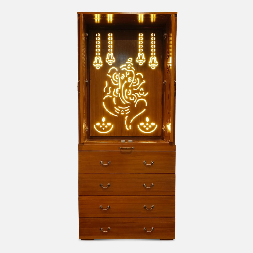 The Anugraha teak wood mandap in teak color is a devotional furniture piece crafted with elegance and detail. Its illuminated structure combines beauty and practicality, creating a calm environment for worship. The front doors feature a balanced artistic design that glows when light passes through, forming an inspiring visual focus. The teak color surface enhances the natural beauty of the wood while adding depth to the overall look. The Ganesha motif inside serves as the sacred centerpiece and symbolizes auspicious beginnings. The lighting highlights every detail of this big pooja mandir, making it visually serene and spiritually uplifting. This pooja mandap is convenient and well organized with its spacious drawers and strong structure to support the daily rituals. Everything is made with consideration of the master touch and piety. The design blends with both the traditional and modern homes to provide an equitable environment of tranquility and comfort. This large wooden temple is an ideal blend of art, functionality and divinity.