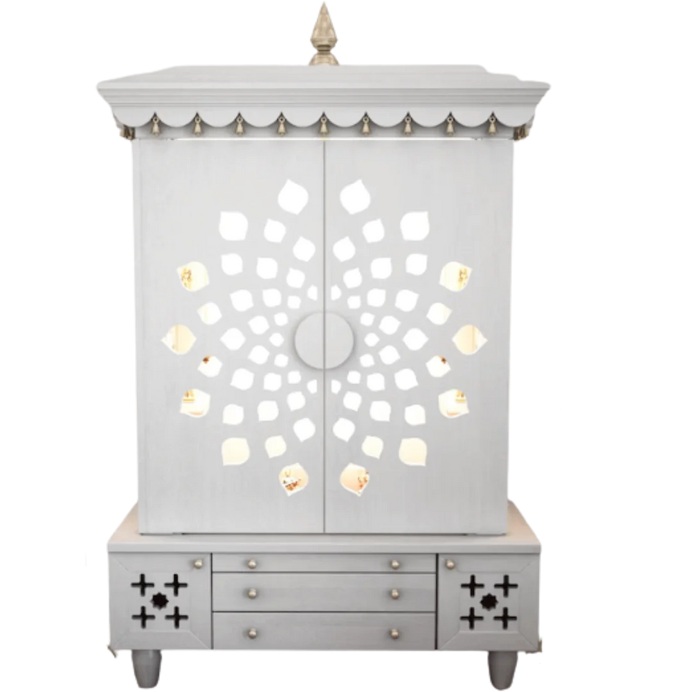 The Anviksha Teakwood Pooja Mandap is a big temple for home that brings peace and devotion to your prayer area. It has a white color finish and a glowing OM panel at the back that makes the space feel calm. The floral jaali doors let light pass through and look bright when the inner lights are on. This large pooja mandir has shelves inside where you can neatly place idols and pooja items. Every part is made to match both tradition and modern style. The cutout patterns allow air and light to move inside easily. It also has drawers and a pull-out tray to keep daily-use items in order. The structure is strong and made to last. The white color gives it a soft and pure look. This big home temple is good for living rooms or quiet corners and makes your pooja space feel special and sacred.