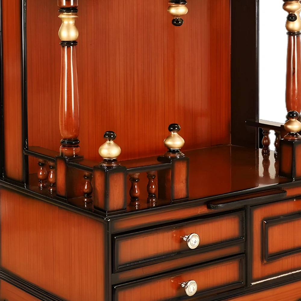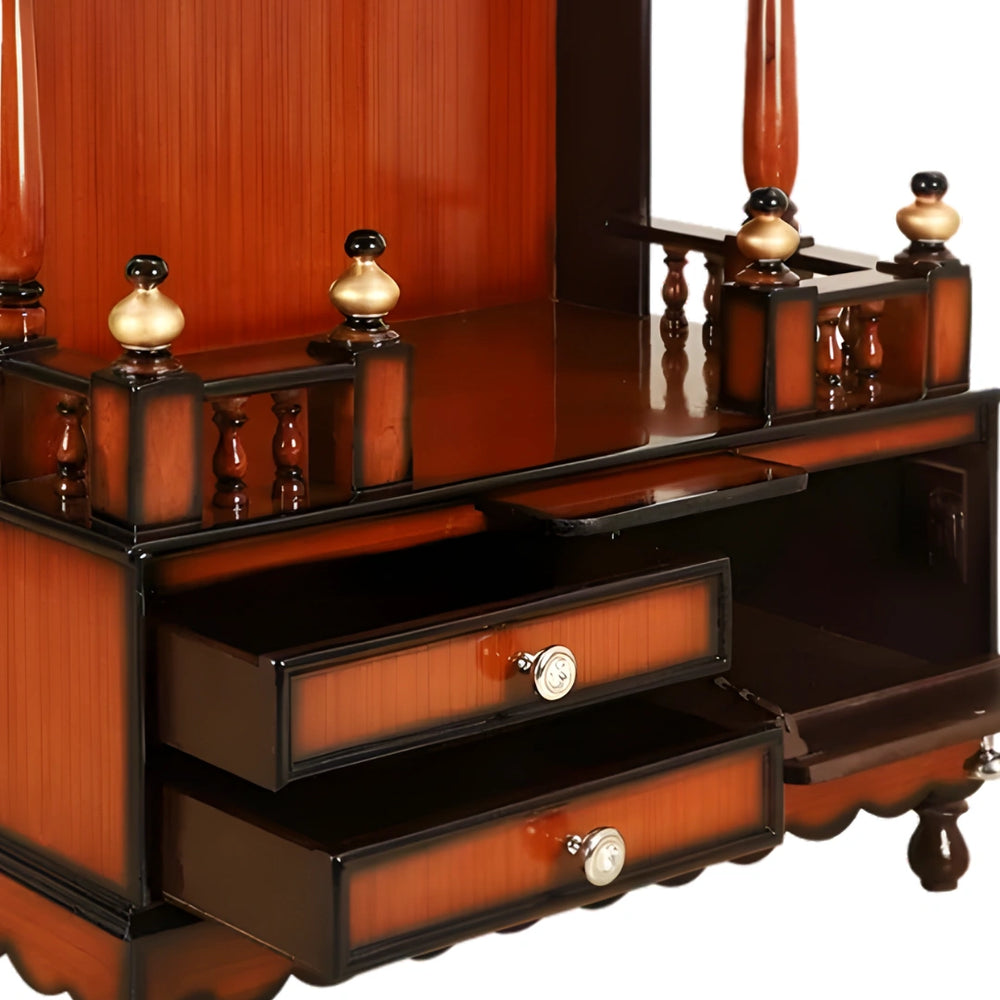 This wooden mandir for home not only enhances the aesthetic appeal but also adds practical functionality to improve your pooja experience. With built-in shelves and spacious drawers, it provides ample storage for prayer books, incense sticks, and other essentials, keeping your pooja space organized and clutter-free. The drawers glide smoothly for ease of use, while the elegant knobs add a refined touch, making this mandir both functional and visually appealing.
