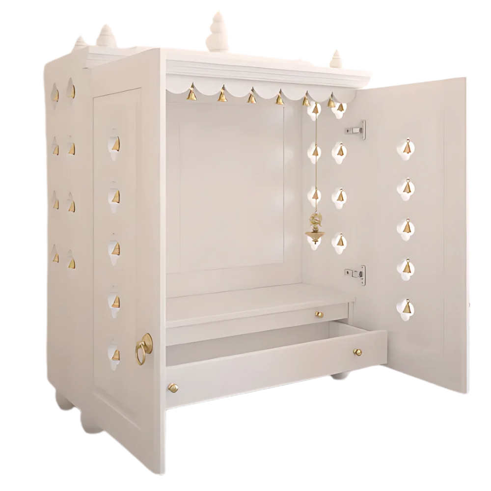 The Aravaya wooden temple has a simple and neat look. It does not have heavy carvings but shows plain panels with brass bells fixed in the doors and side panels. This simple design makes the temple look good in any room without making the space look too full. The two doors open to a big area inside where a central brass diya can be placed. This adds both use and a holy feel. The temple is small in size but strong and will stay in good shape for a long time. The white color adds calmness, which brings a peaceful and holy feel to your home. Its simple design is good for people who like a clean and peaceful look in their pooja space.
