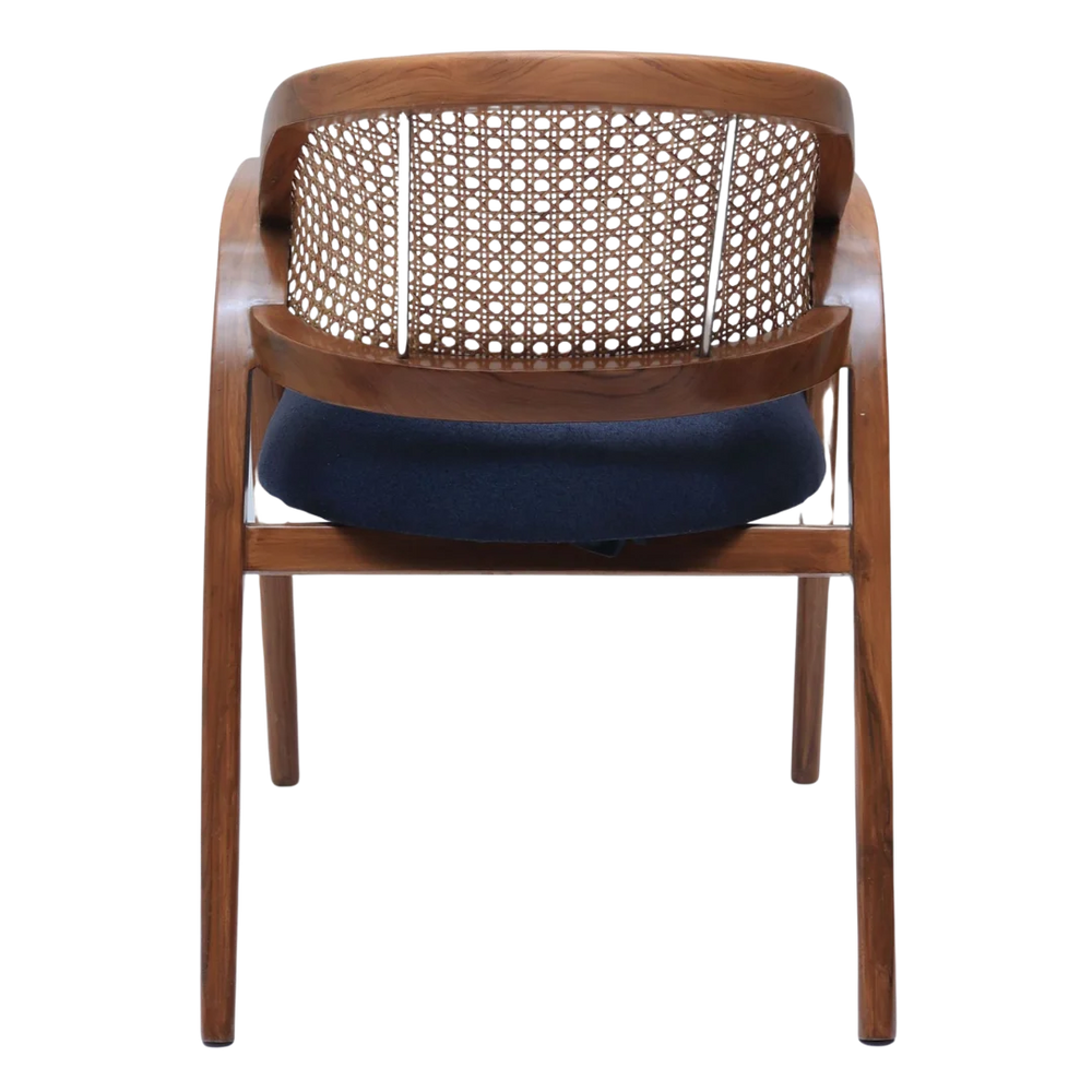 The backrest of this chair has a curved shape made with fine cane weaving and a strong teak frame. The arched design gives good support and adds style which makes the chair special in both modern and traditional rooms. The cane pattern allows air to pass through and shows skilled handwork. Thin teak bars are placed in between the cane to break the pattern and add strength. This cane chair looks good from every side. The curved back gives the hard frame a soft touch. The backrest leans slightly which helps you sit in a relaxed position. The rounded top edge gives a smooth finish and makes the chair look complete from the back.