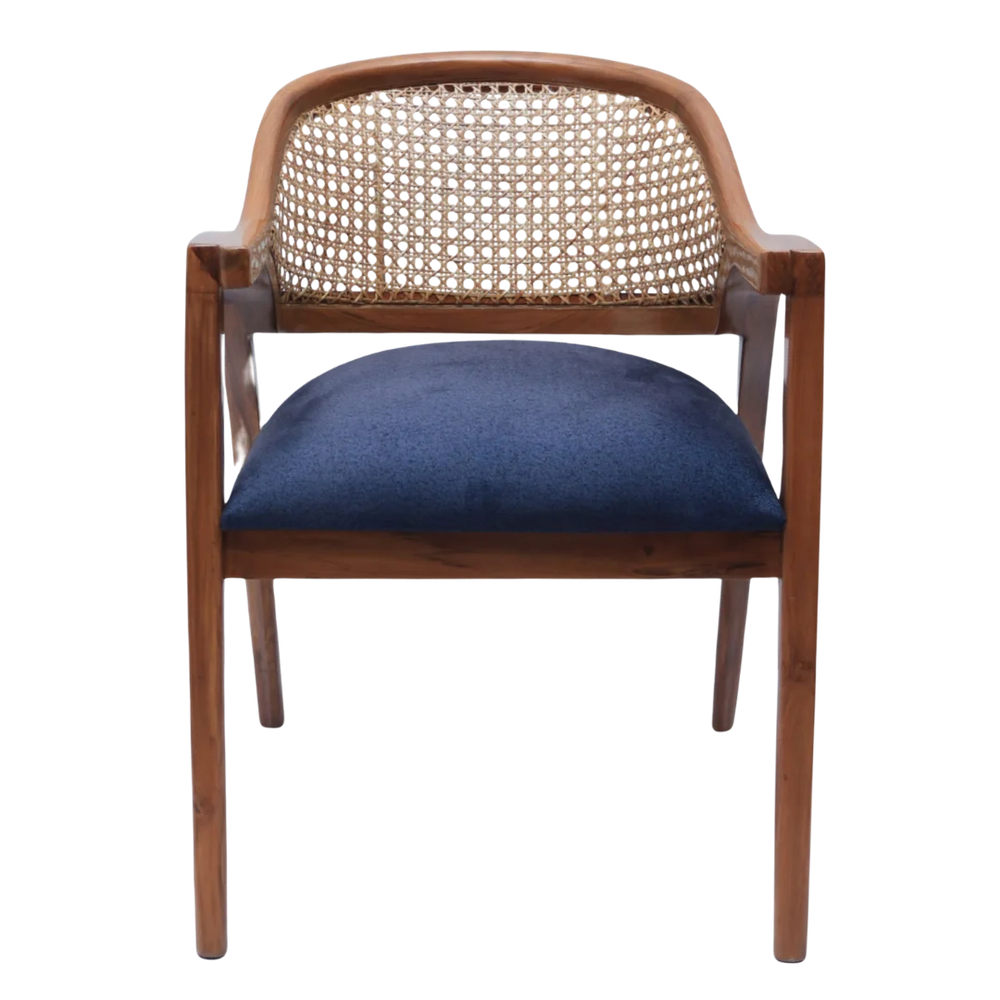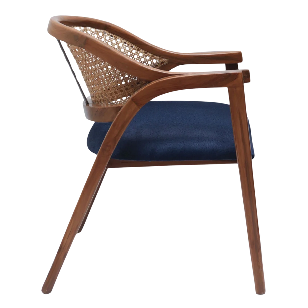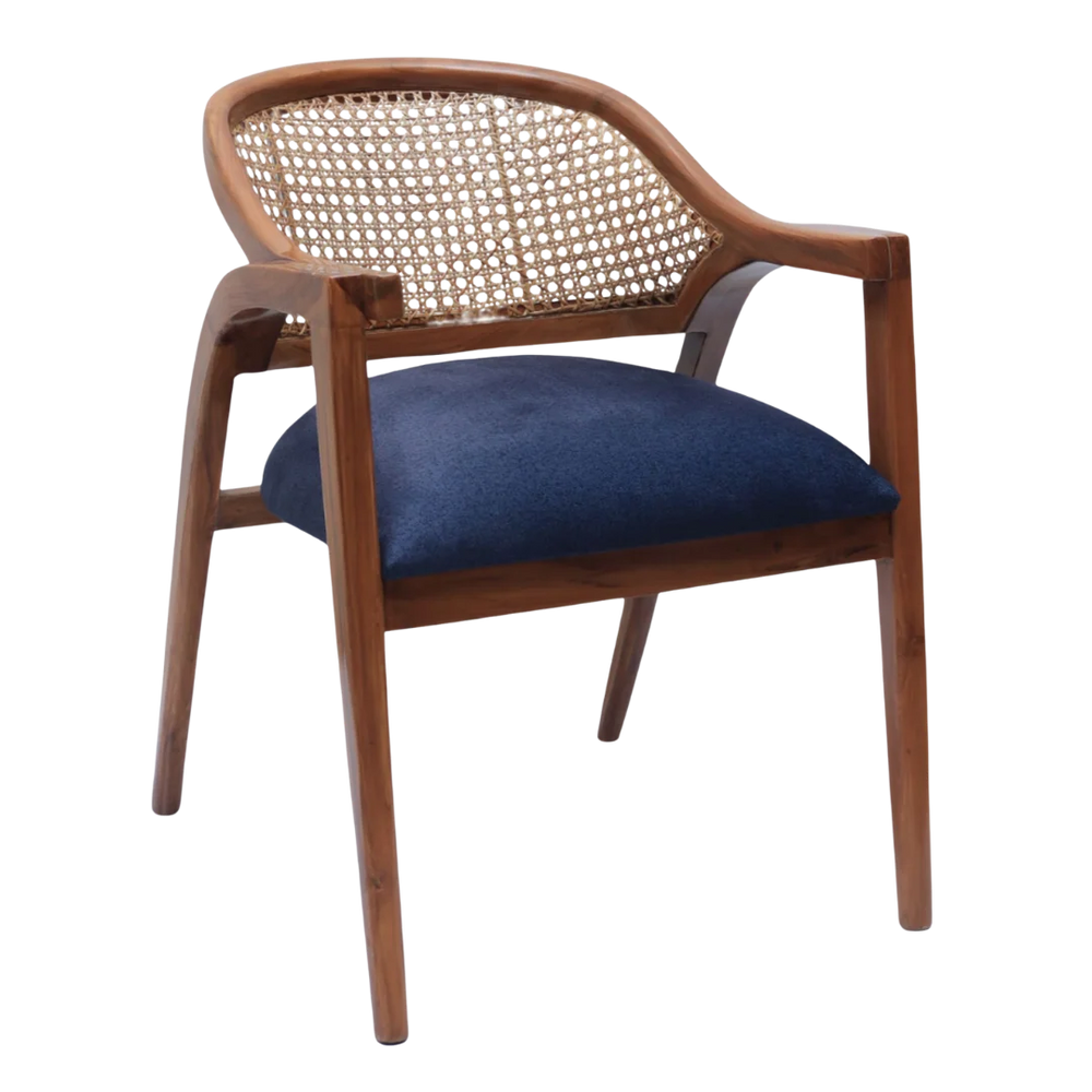 The Arbor Teak Wood Arm Chair in teak and blue is a good mix of classic style and everyday comfort. The curved shape and simple design of this wooden arm chair give good support while fitting well in small spaces. The main visual element of this chair is the cane backrest which is handcrafted and bends smoothly with the frame. The thick blue cushion of the chair make it look good in any kind of the room type. The circular legs and smooth joints of the chair give it strength and stability. The teak polish shows the natural wood lines and helps the chair look nice in any room. The blue cushion stands out and adds a soft and calm look. You can keep this chair in a reading corner or bedroom and it will give both comfort and good style. The curved cane back and tilted support make sitting easy and comfortable.