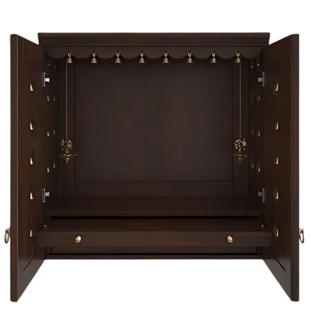 Its minimalist layout, paired with essential features like bell accents and drawer storage, makes it ideal for apartments or smaller rooms. The soothing wenge and gold palette further helps maintain a sacred, clean, and positive atmosphere.