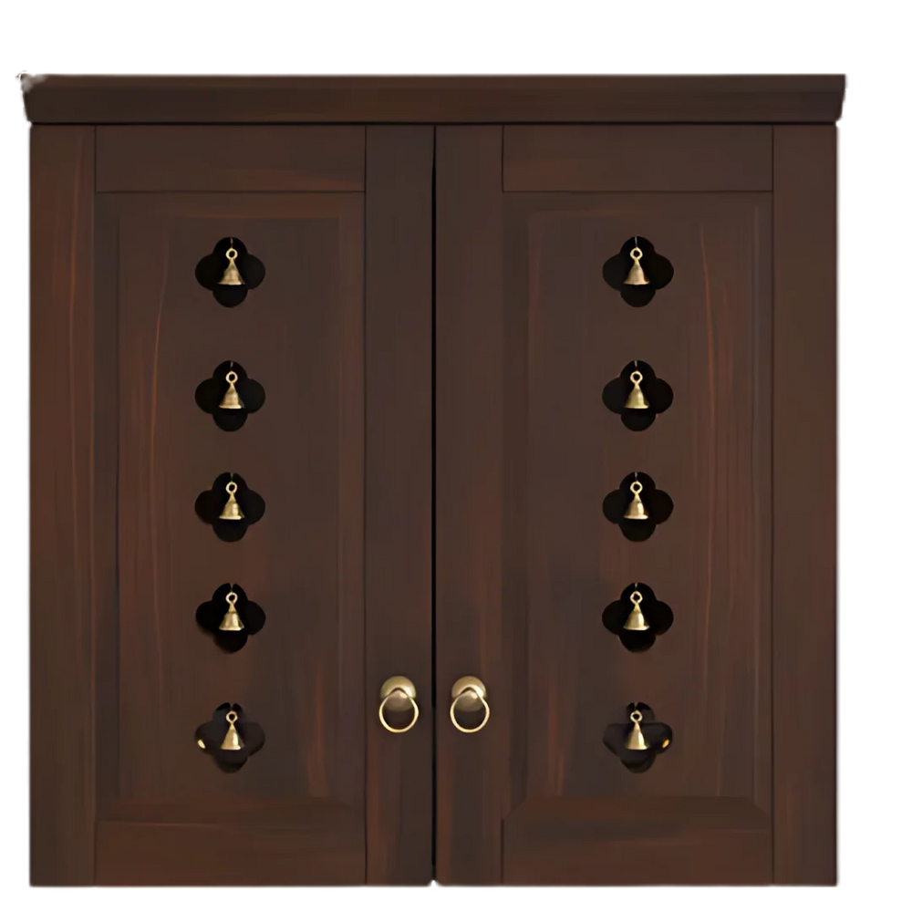 The Barvya Wall Temple is a perfect choice for homeowners looking to create a serene and sacred pooja space, especially in compact or modern interiors. Designed in a wenge finish with graceful floral bell-cut designs and subtle temple-style elements, this wall hanging pooja mandir reflects elegance, tradition, and divine energy. The symmetrical bell carvings on the door panels and decorative shapes on the side panels enrich its sacred charm. At the top, five soft-edged dome finials rise above a scalloped crown with metallic bells gently suspended, capturing the traditional spirit of temple architecture in a compact, elevated format.