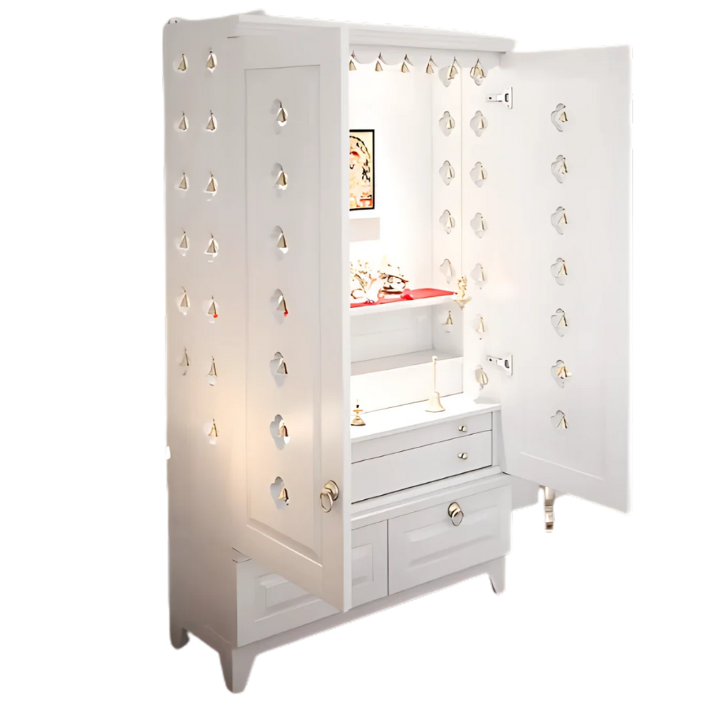 The Bheema White Mandir is a big temple for home that brings both beauty and space. It is made for large pooja setups and has tall double doors with bell shaped cutouts that give airflow and look nice. The white color gives a bright and pure feel which makes it perfect for your prayer area. The doors open fully and show wide shelves inside with a strong back panel to hold idols and photo frames. The bottom part has two big drawers and two large cabinets so you can keep all pooja items in one place. A top border adds height and gives the mandir a bold look. This big mandir is strong and steady for daily prayer use. The sharp white color matches both modern and traditional rooms. Inside the mandir soft LED lights give a warm glow that feels peaceful. The handles knobs and bells in gold color look rich and add shine to the white body. This large pooja mandir fits well in living rooms pooja rooms or corners of the house.