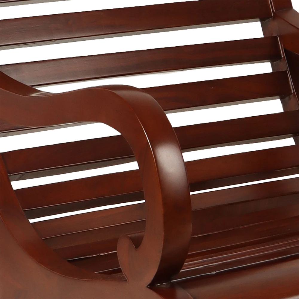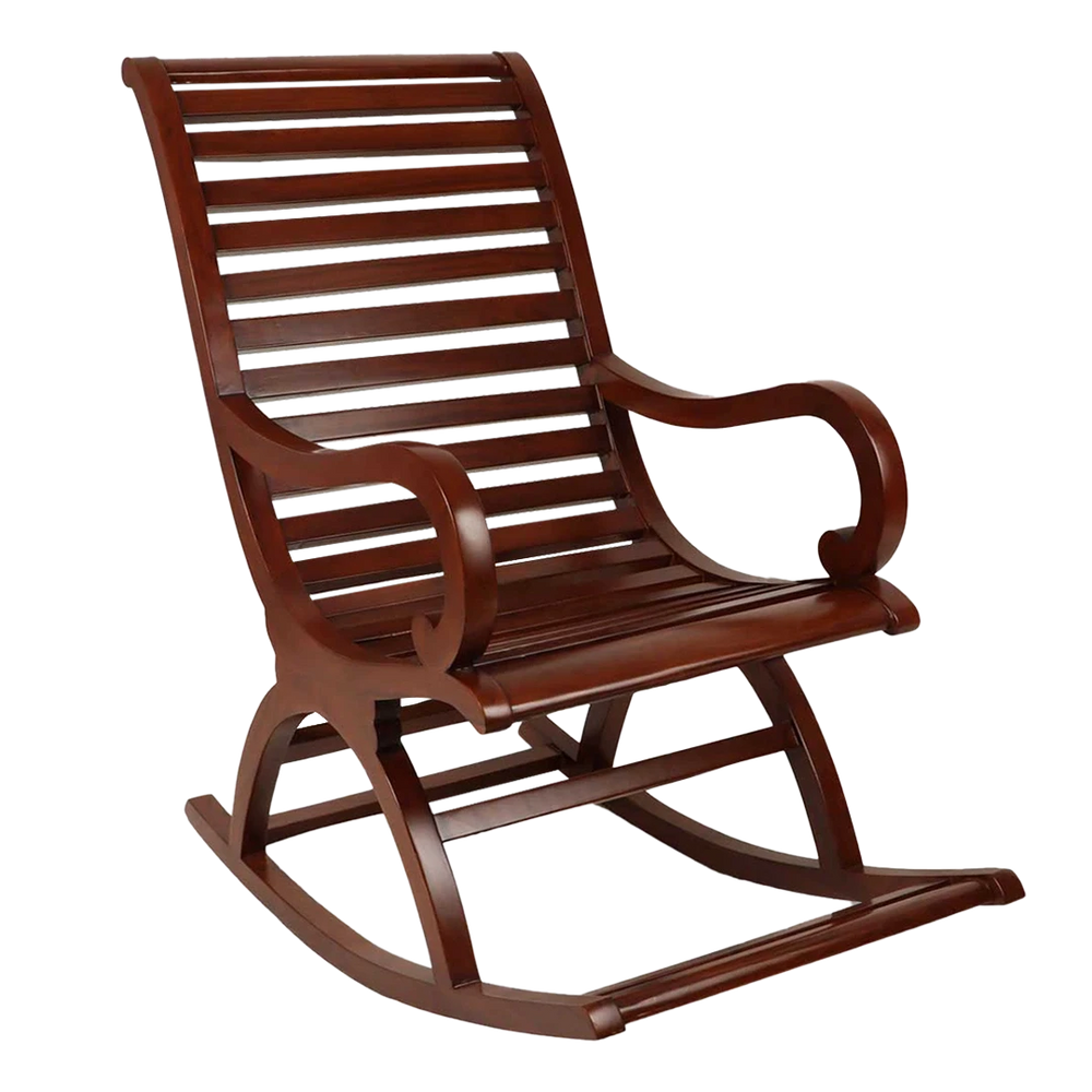 The features of the wooden rocking chair have beautifully curved armrests which are both stylish and of function. The armrests are natural resting places, allowing you sit back even easier. The overall design of the chair is complimented by the graceful curves. The armrests are perfectly well proportioned, fitted comfortably, and give added support. The design allows for the arms to rest relaxed without feeling strained, thus making the chair more usable or a resting chair. The smooth Brown texture of the arms adds a rich feel to its appearance. These armrests balance the chair’s aesthetic with its comfort.