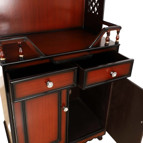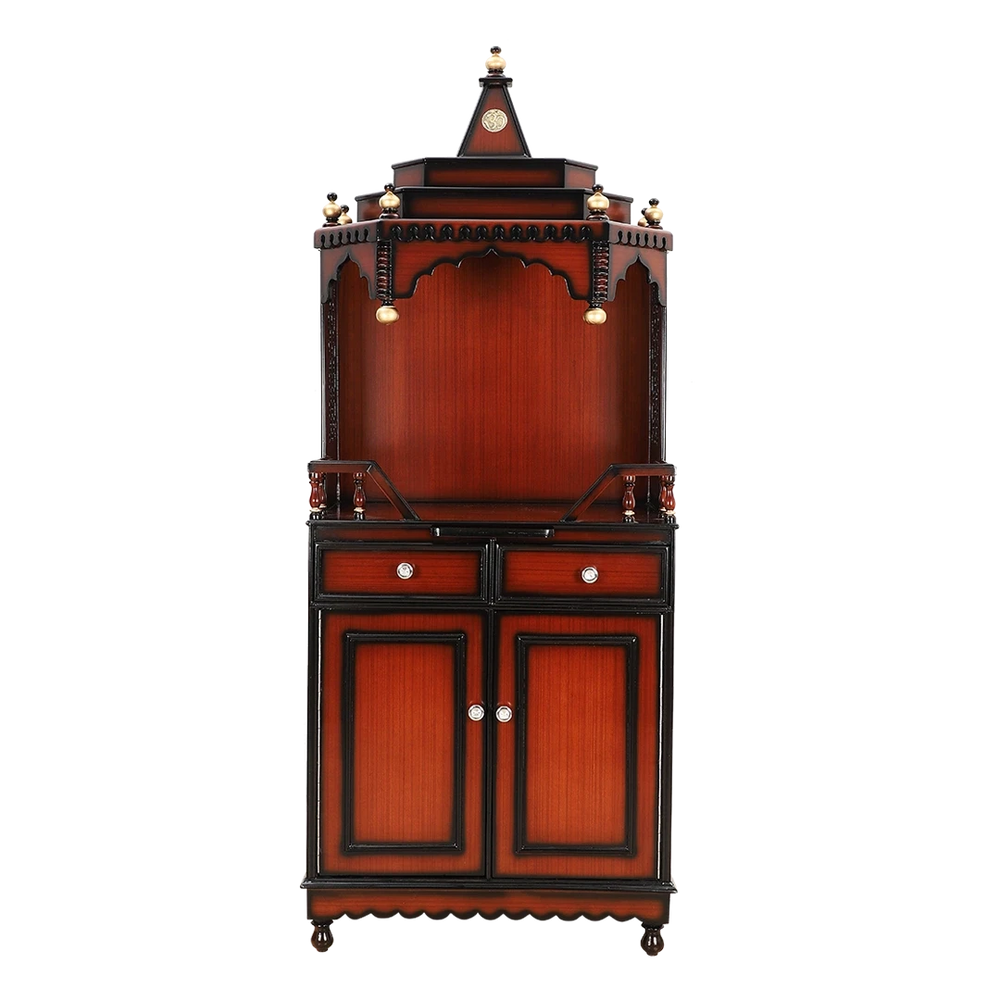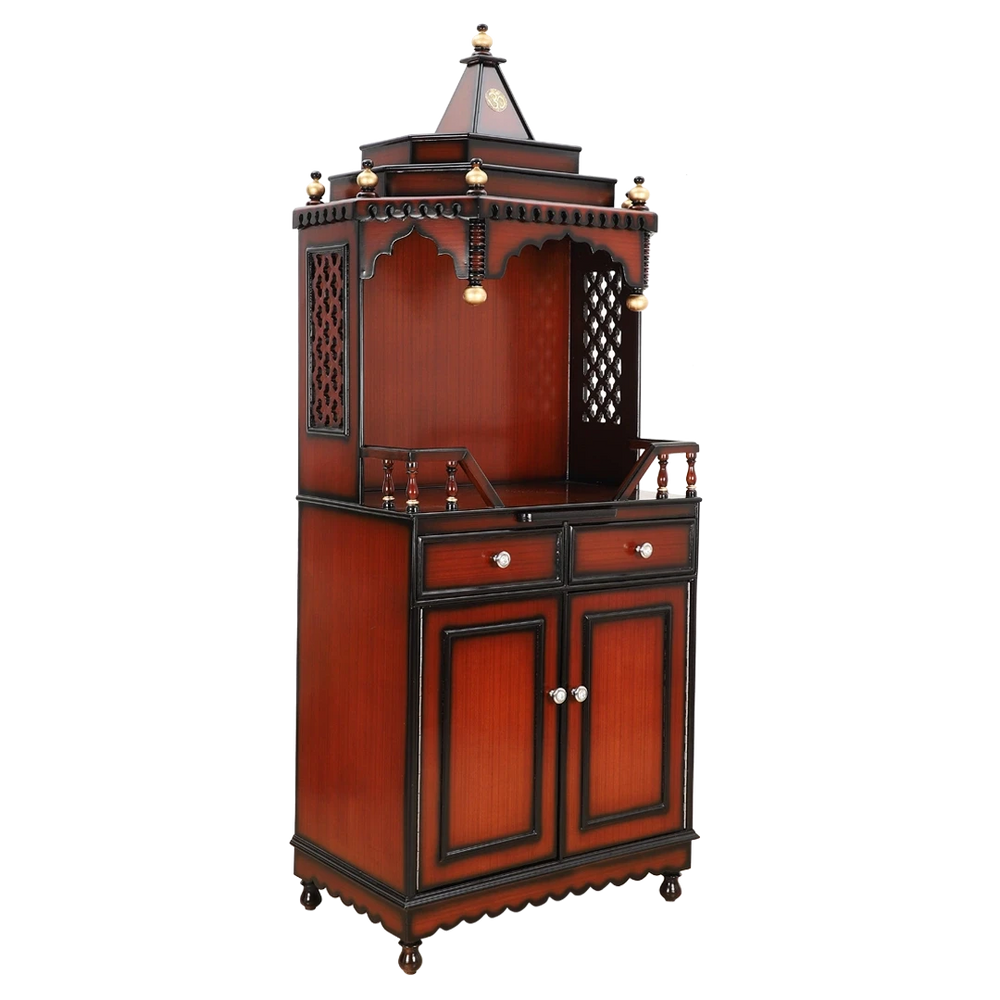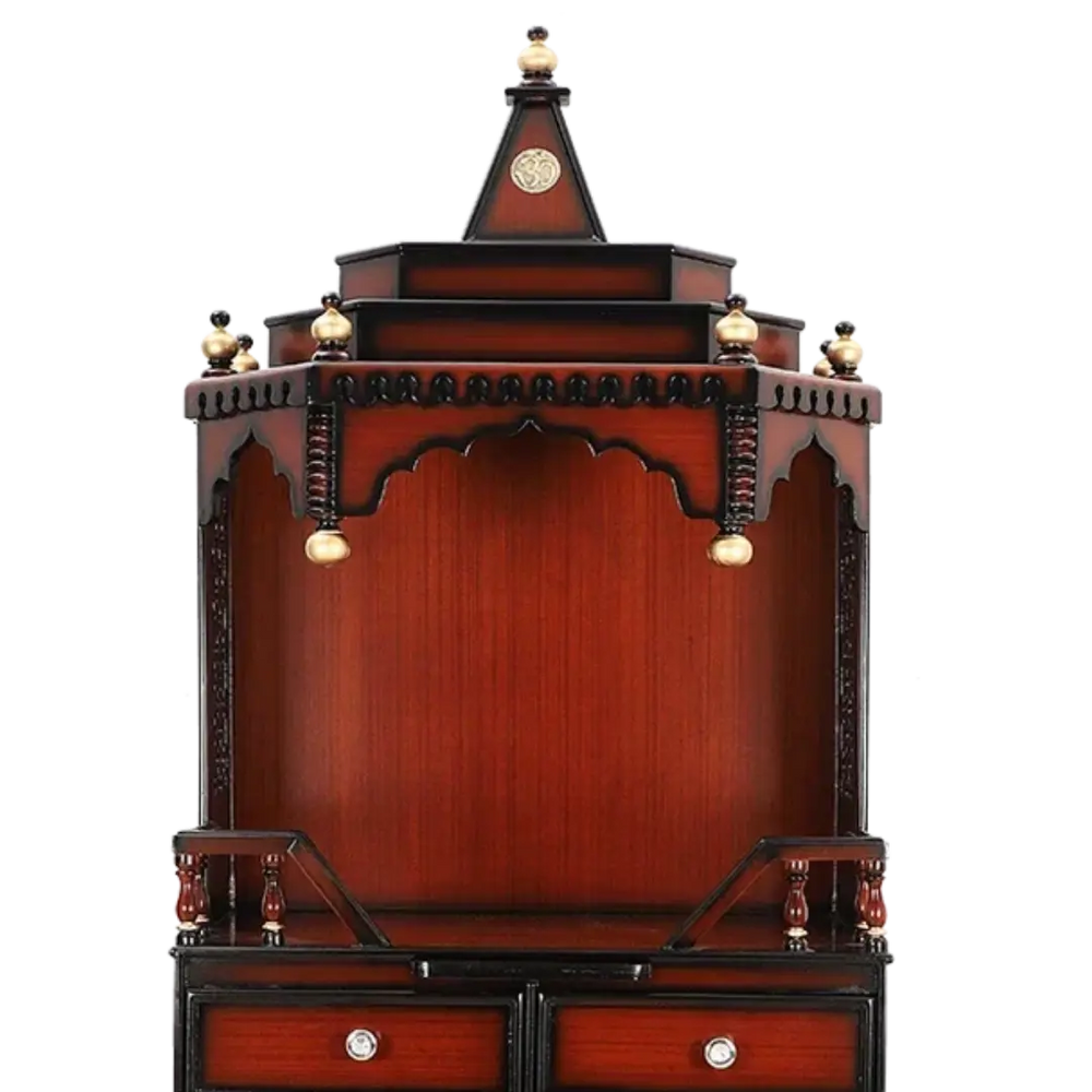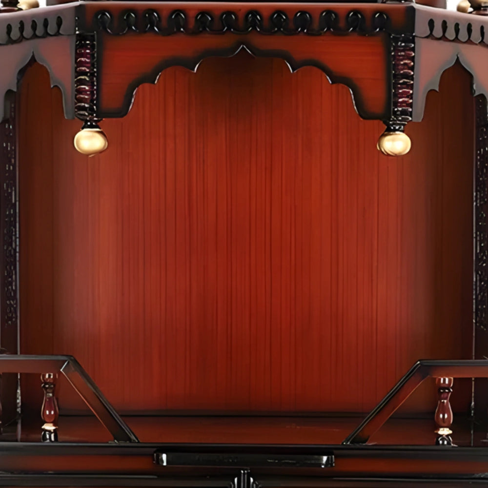 Furthermore, adding to the intrinsic value of the big temple for home in brown color is its customizability. You can add a personal touch to the temple by creating partitions in the drawers, installing extra shelves for more storage, installing curtains to the pooja area, or even creating a multi-level platform to put up more deities. The robust nature of teakwood allows modifications to be made after purchase.