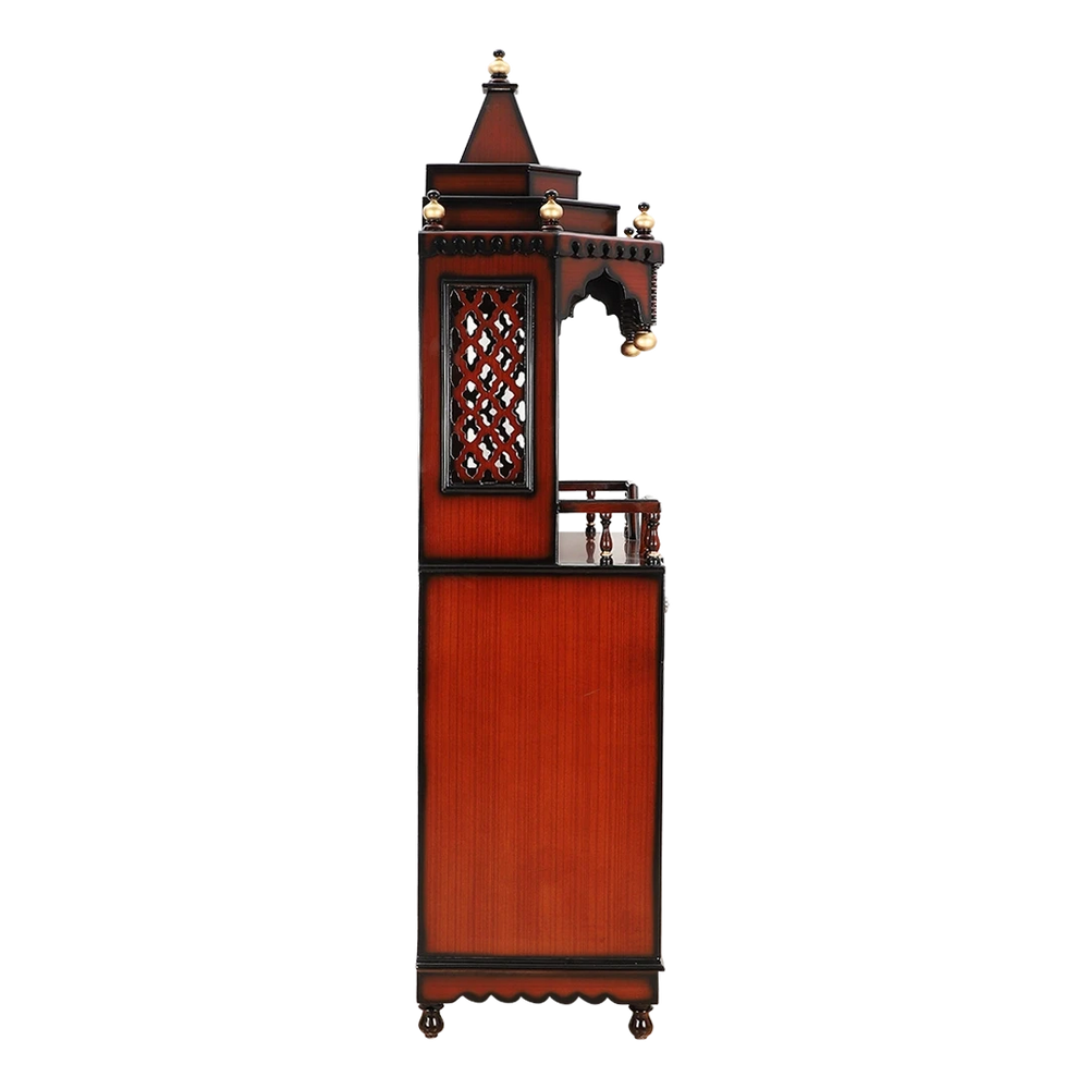 In simple words, the jali work of the 6 feet pooja mandir in rich brown color is the symbol of traditional Indian temple design, and the unique chemistry of light and shadows creates a hypnotic visual effect that enriches your spiritual experience during worship. In other words, the jali design adds to the charm and ambience to this 6 feet pooja mandir at the same time, enhances the functionality and artistic quotient in your pooja space.