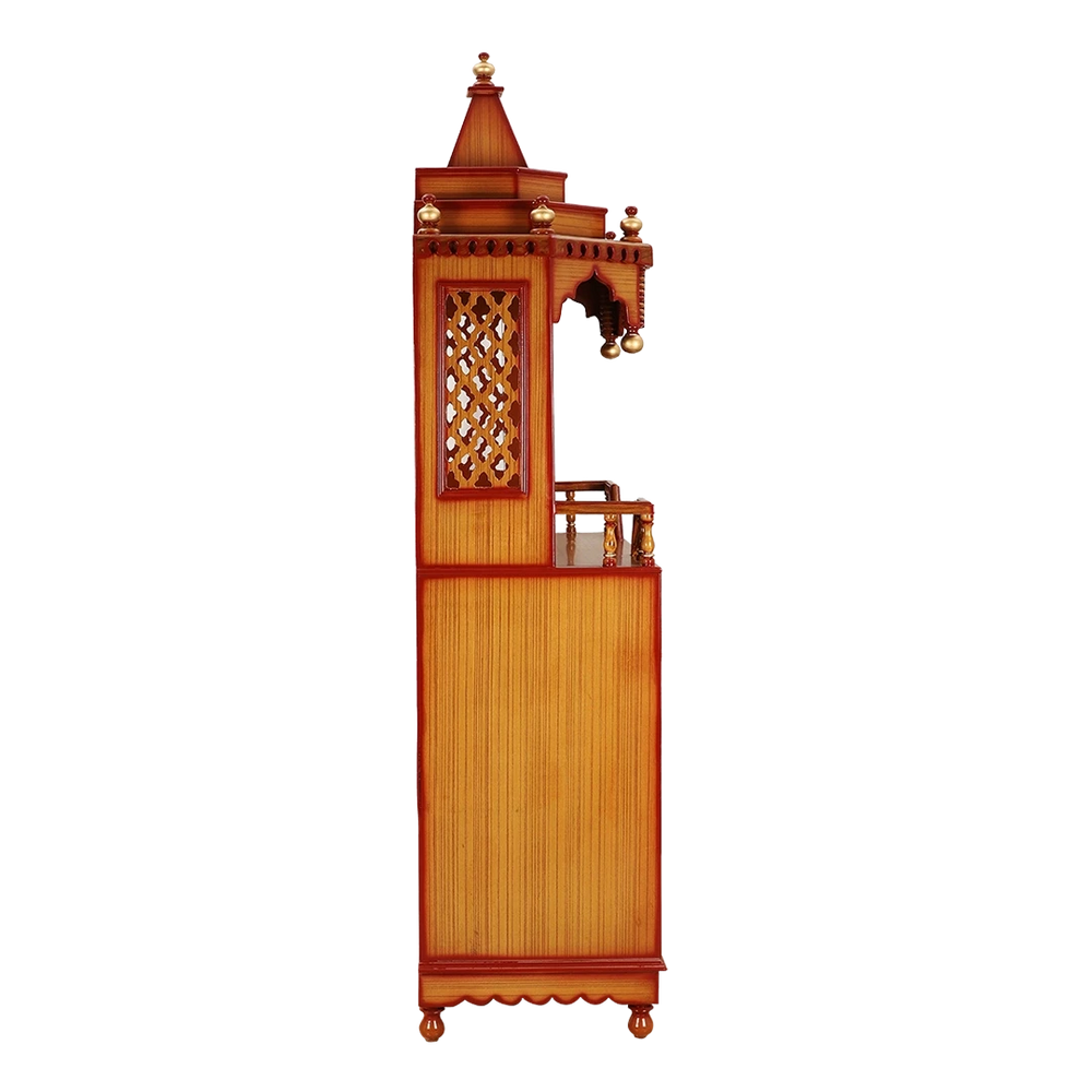 In simple words, the jali work of the 6 feet pooja mandir in natural teak color is the symbol of traditional Indian temple design, and the unique chemistry of light and shadows creates a hypnotic visual effect which enriches your spiritual experience during worship. In other words, the jali design adds to the charm and ambience to this 6 feet pooja mandir at the same time, enhances the functionality and artistic quotient in your pooja space.