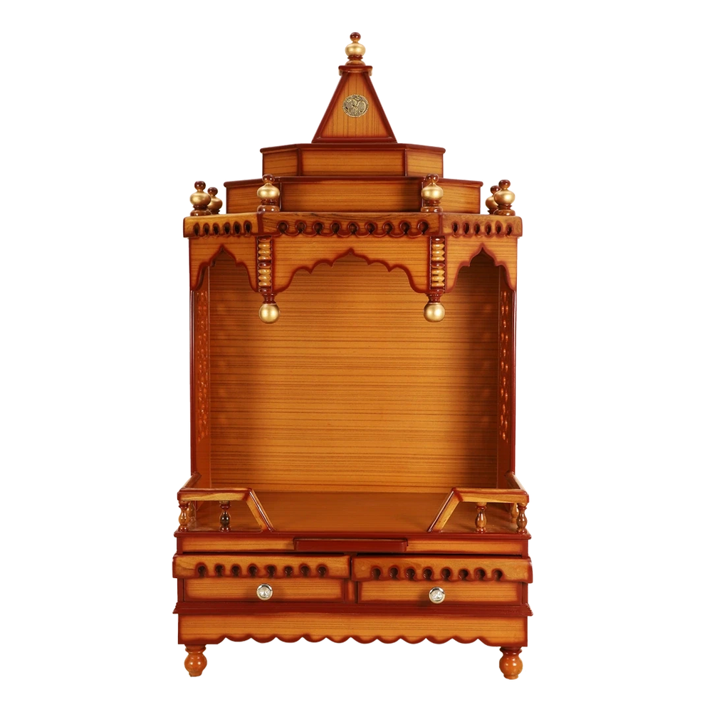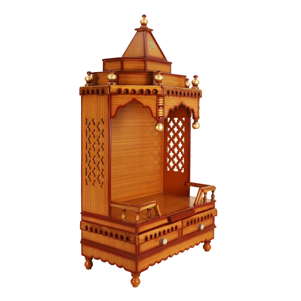 Teakwood has long been valued as a luxury furniture material and continues to be a preferred choice for its quality. This pooja mandir for home uses teak wood making it a valuable addition to your space. Teakwood contains natural oils that provide resistance to water and termites ensuring that your wooden mandir for home remains beautiful over time. Its anti-rot properties ensure the mandir's structure stays strong and durable for years. This is especially important for a pooja mandir for home which is often exposed to smoke from incense oil lamps and other elements commonly used during rituals making it a reliable and lasting choice.
