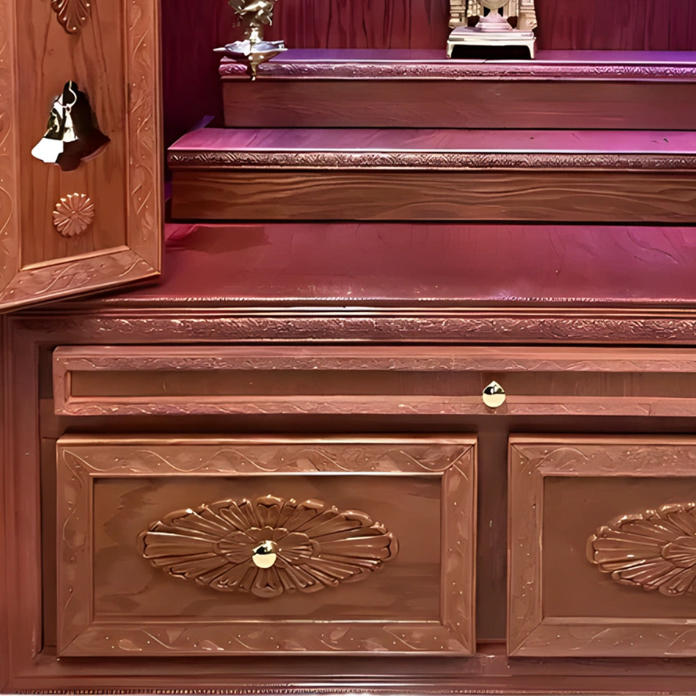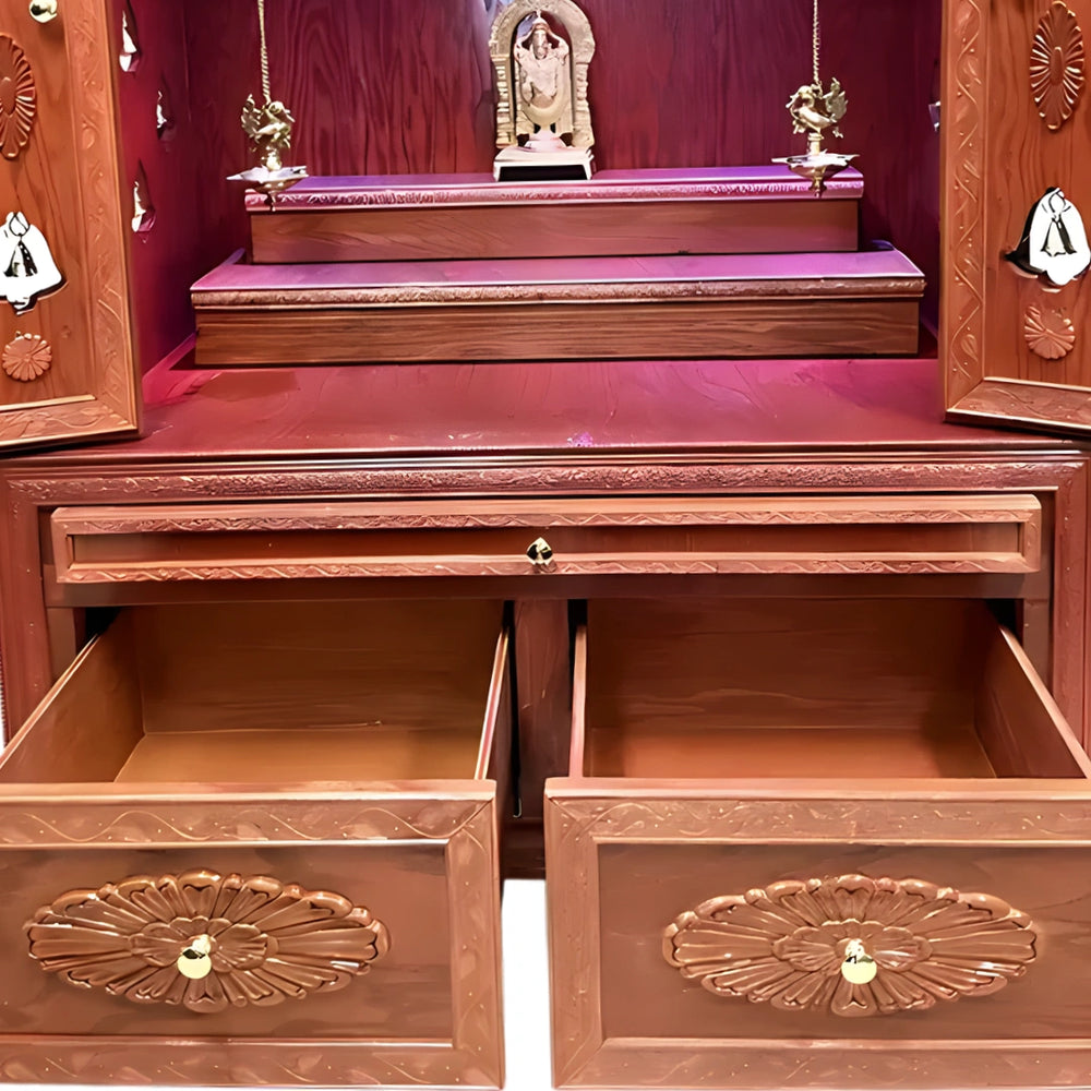 At the base of this big mandir for home are spacious drawers that can store pooja items safely. The handles are easy to grip and look elegant. The storage is useful for daily items like incense, lamps, and oil bottles. This makes rituals smoother as everything stays nearby. The drawer carvings match the top and give the temple a connected look. These drawers are deep and strong. The design helps in maintaining a neat setup. It supports daily rituals and also works well during festivals. The color of the drawers blends with the full body. Extra pooja cloths and books can also be stored. It saves time by keeping everything in one place.